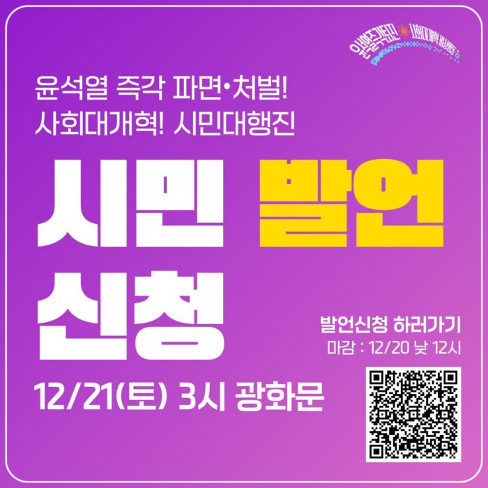 12월 21일 토요일 집회에서도 시민들의 생생한 목소리가 담길 수 있도록 시민 발언 신청을 받고 있습니다!