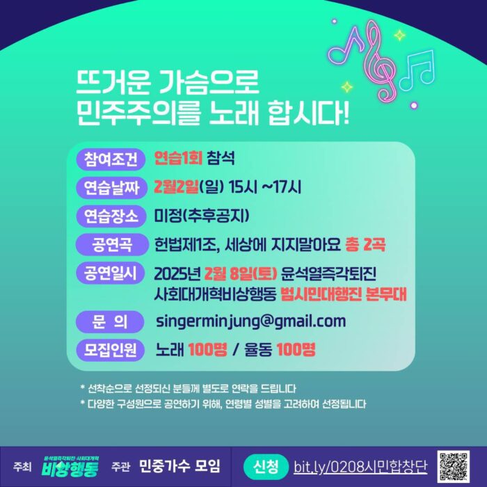 윤석열 퇴진과 사회대개혁을 바라며 역사의 광장에서 100만 응원봉과 함께 노래할 시민합창단을 모집합니다.