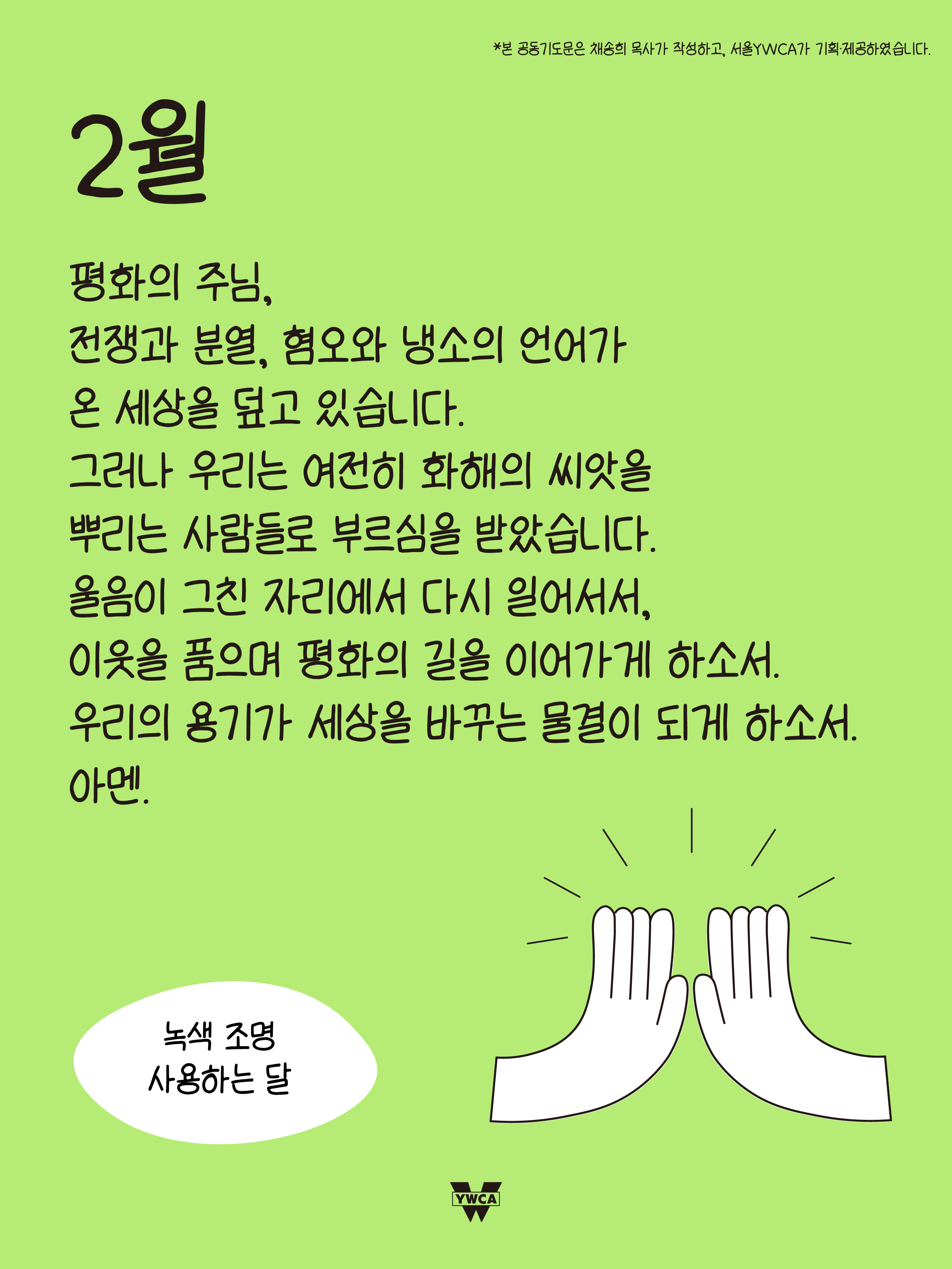 그 출발점으로, 전국이 한 마음으로 드리는 「2026 YWCA 전국공동기도」를 매달 나눕니다.