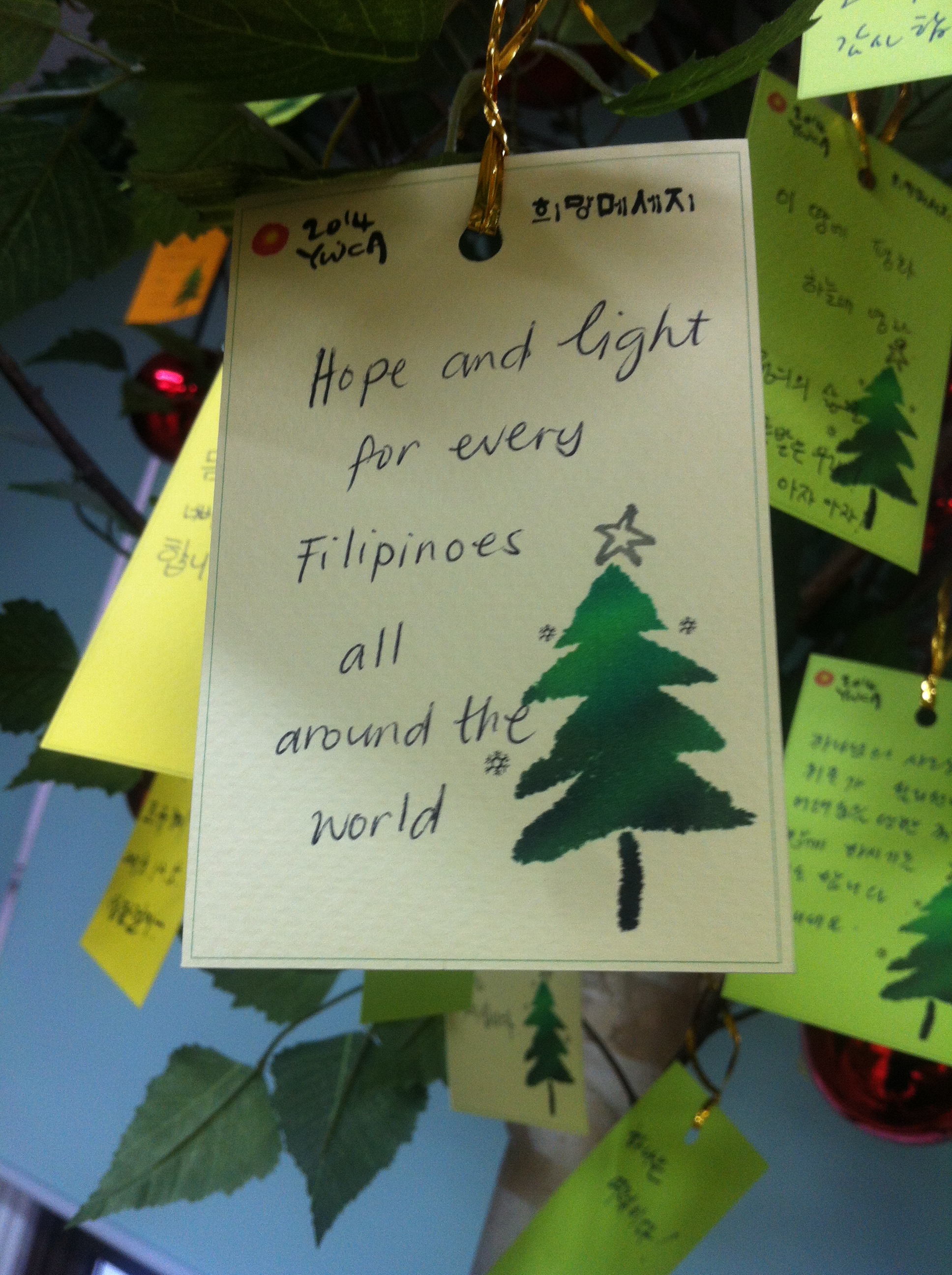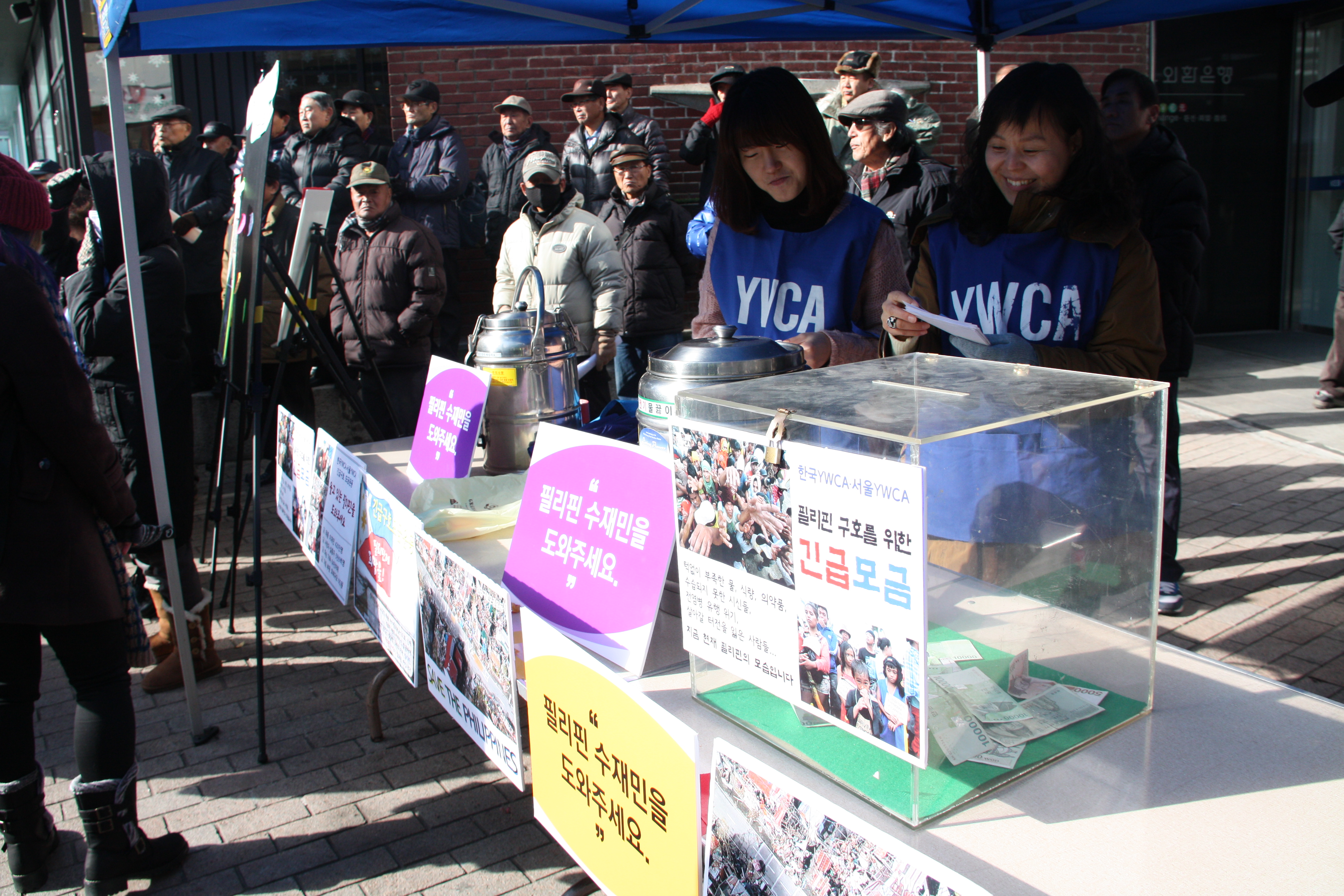 The YWCA of Korea had been called to respond to a significant typhoon in the Philippines and responding with donations for the people in desperate need. From November 18 to December 31, 2013, the YWCA of Korea had been conducting a national campaign for the donations responding to the impact of Typhoon Haiyan. In total 52 local YWCAs had been holding a fund-raising campaign and taken actions for donations to the Typhoon Haiyan.