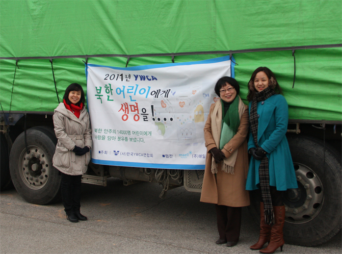 YWCA of Korea (President Kyung Eh Cha), in collaboration with 52 local YWCAs and Maeil Milk(Maeil Dairies Co. Ltd based in S. Korea), sent four tons of powdered milk to the city of Anju, south Pyongan province, in North Korea on December 14, 2011. This shipment of powdered milk was distributed to approximately 14,000 children suffering from chronic malnutrition by Anju pedriatic clinics, daycare centers, orphanages, and related organizations.