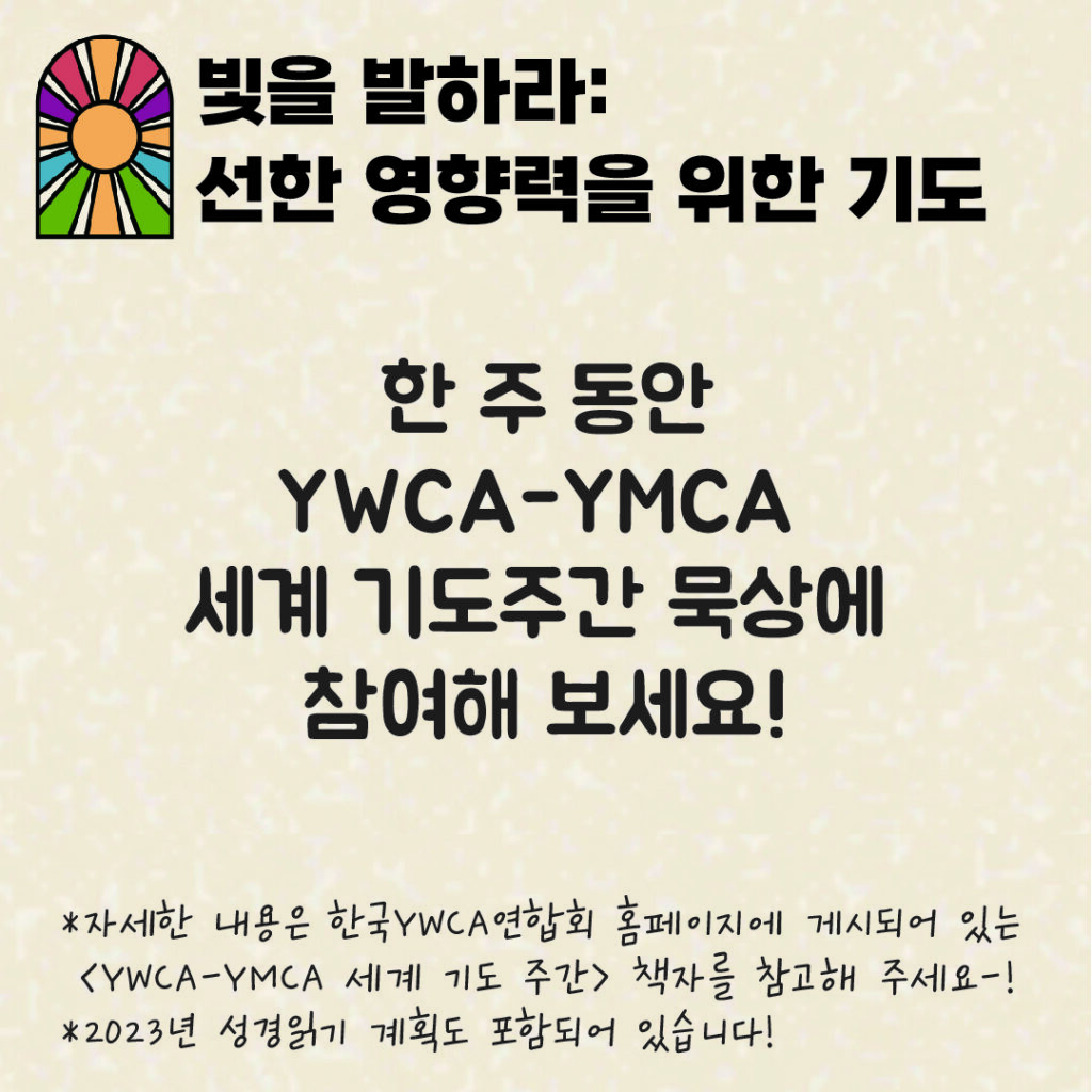 세계YWCA 및 세계YMCA의 필진들이 참여하여 작성한 기도책자인 만큼, 돌아오는 한 주 동안은 책자의 안내에 따라 YWCA 운동의 바탕이 되는 믿음의 묵상과 실천 이어가시기를 바랍니다. 가득 채워지는 시간 보내시기 바랍니다!??