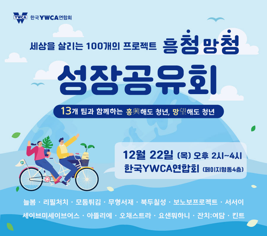 한국YWCA가 100주년을 맞이하여 청년들이 흥하고, 청년들이 소망하는 세상을 위해 ‘흥청망청-YWCA 세상을 살리는 100개의 프로젝트’를 진행하였습니다. 지난 6개월간 13개팀의 프로젝트를 마무리하며 함께 우리들의 성장 이야기를 들어보고 응원하고자 합니다.