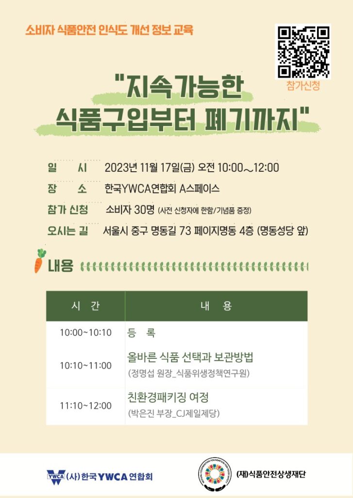 한국YWCA연합회가 식품안전상생재단과 함께 “지속가능한 식품 구입부터 폐기까지”를 주제로 소비자 교육을 진행합니다. ??