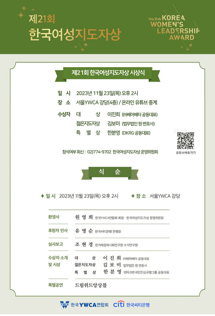 한국YWCA연합회와 한국씨티은행이 협력하여 제정한 한국여성지도자상이 올해로 21회가 되었습니다.
