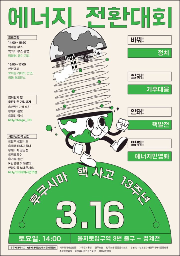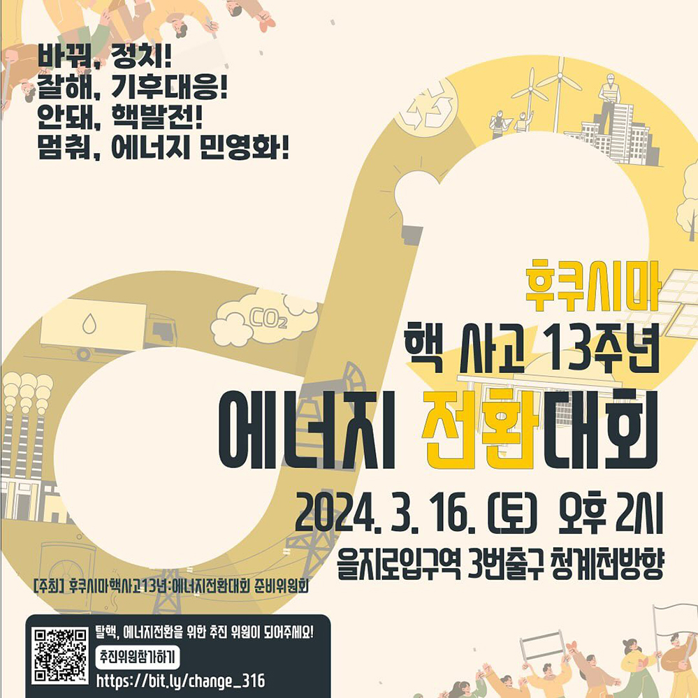 후쿠시마 핵사고 13주년과 4월 총선을 앞두고 탈핵, 기후정의, 에너지 공공성, 정의로운 전환을 바라며 행동하는 모든 분을 초대합니다!