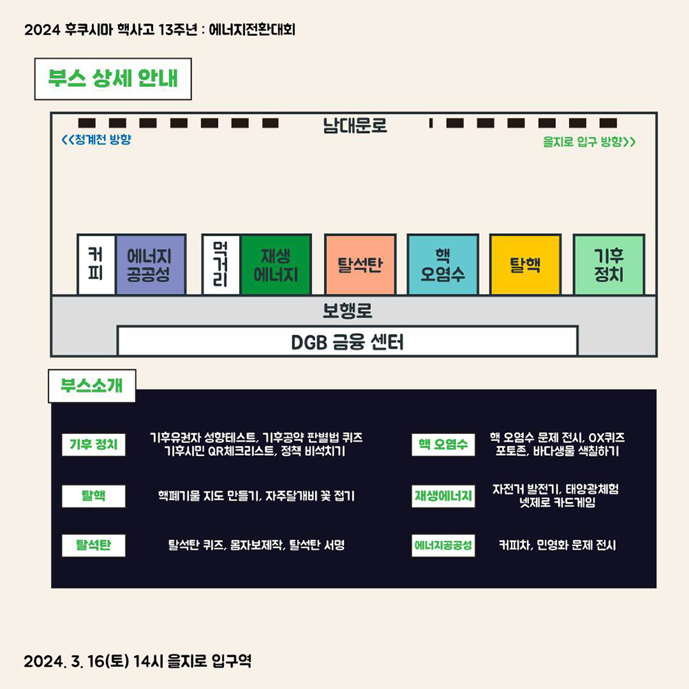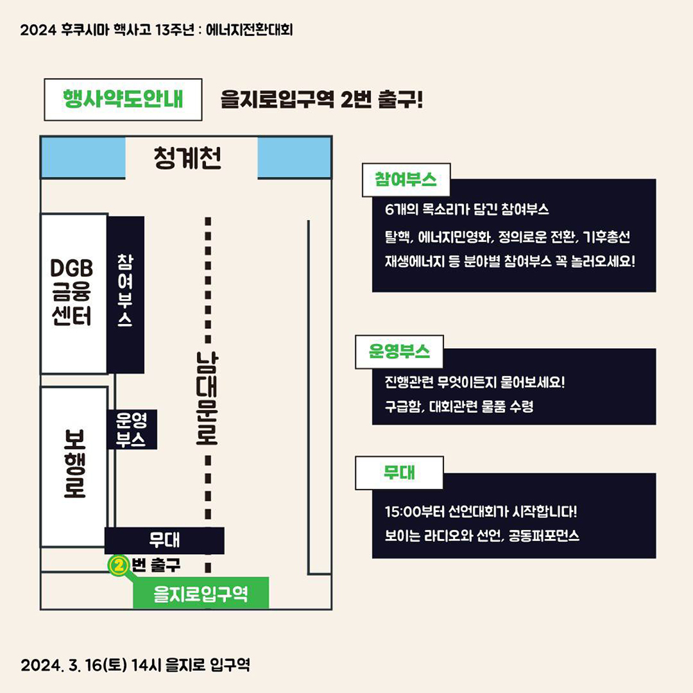 후쿠시마 핵사고 13주년, 4월 총선을 앞두고 탈핵·기후정의·에너지 공공성·정의로운 전환을 바라며 행동하는 당신, 을지로입구역에서 만나요!