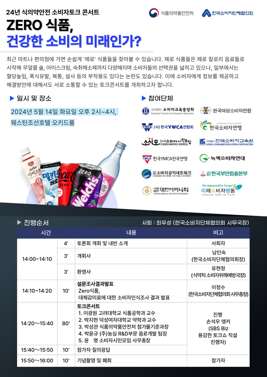 5월 14일 식품안전의날을 맞이하여 한국YWCA연합회 외 11개 소비자단체는 2024 식의약안전 소비자 토크콘서트<ZERO 식품, 건강한 소비자의 미래인가?>라는 제목으로 토크 콘서트를 진행합니다.