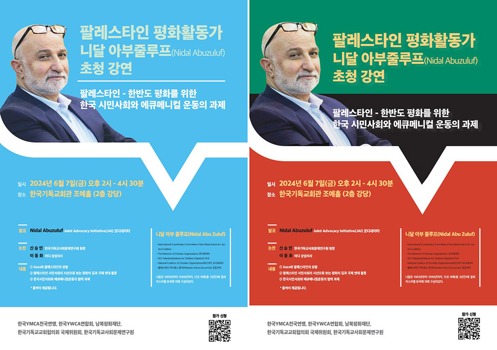 한국YWCA연합회와 한국YMCA전국연맹, 남북평화재단, 한국기독교교회협의회 국제위원회와 한국기독교사회문제연구소가 함께 니딜 아부줄루프(Nidal Abuzuluf) 사무총장 초청 강연회를 개최합니다. 강연회를 통해 팔레스타인(가자지구)의 현 상황과 팔레스타인 평화운동의 역사 및 쟁점에 대해 듣고 한국 에큐메니칼 공동체와 시민사회 연대활동을 공유하며 향후 협력과제를 모색해보고자 합니다. 팔레스타인의 평화를 기원하는 분들의 많은 관심과 참여 바랍니다.