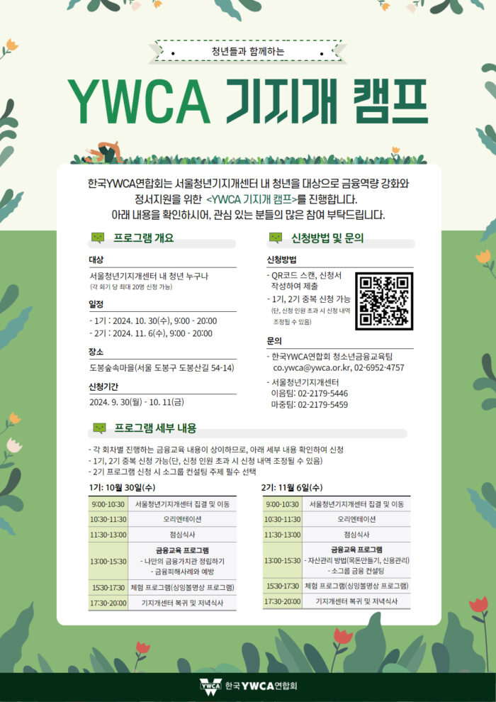 청소년금융교육팀에서는 고립은둔청소년들을 대상으로 금융역량 강화와 정서지원을 위한 <YWCA 기지개 캠프>를 진행합니다.?