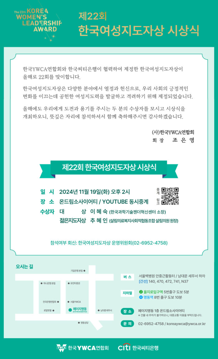 한국YWCA연합회와 한국씨티은행이 협력하여 제정한 한국여성지도자상이 올해로 22회가 됐습니다.