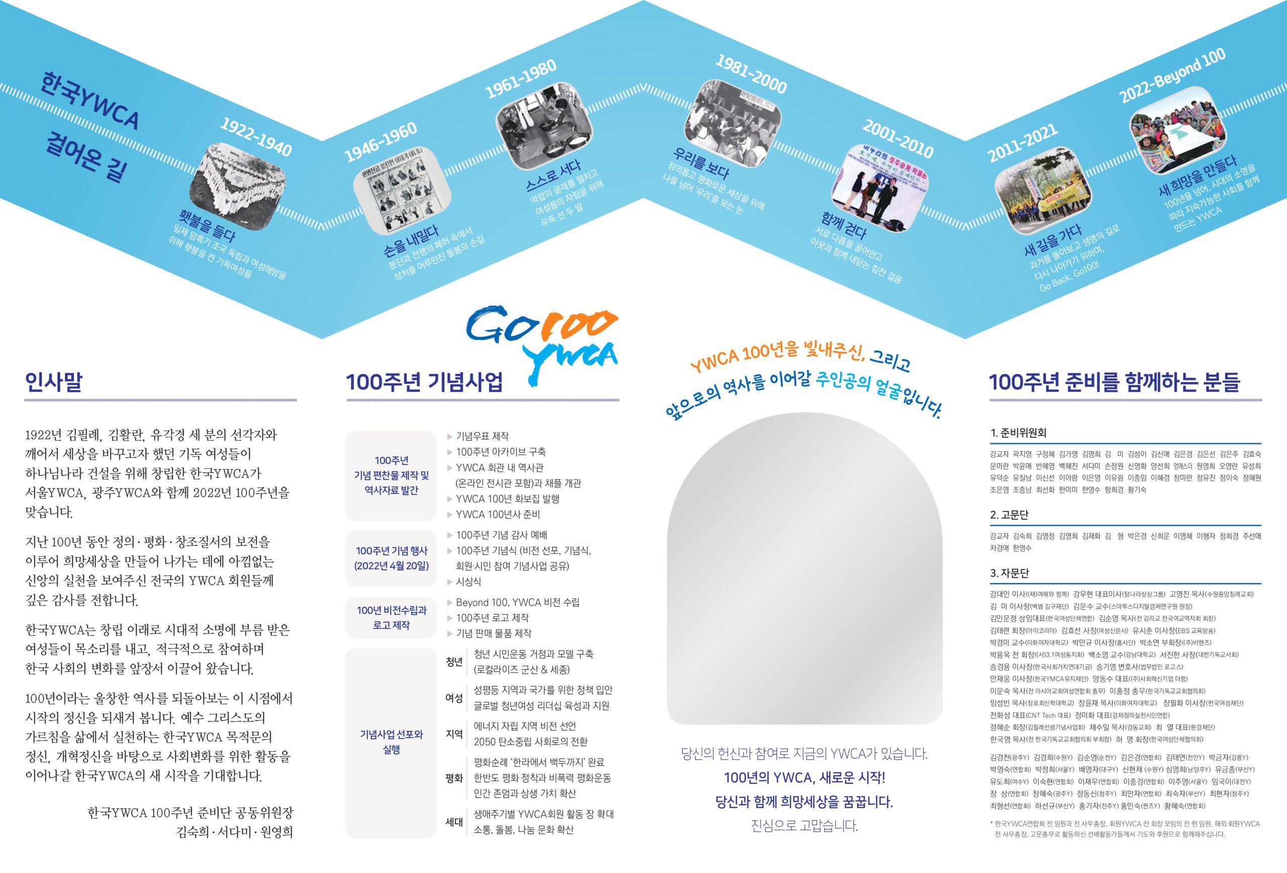 첨부된 리플릿에는 역사관 ‘이제’의 연대기별 정리를 요약한 한국YWCA 걸어온 길, 100주년 기념사업, 준비위원회·고문단·자문단 명단, YWCA 목적문, 한국YWCA 전국조직도와 후원요청글이 담겨있습니다.