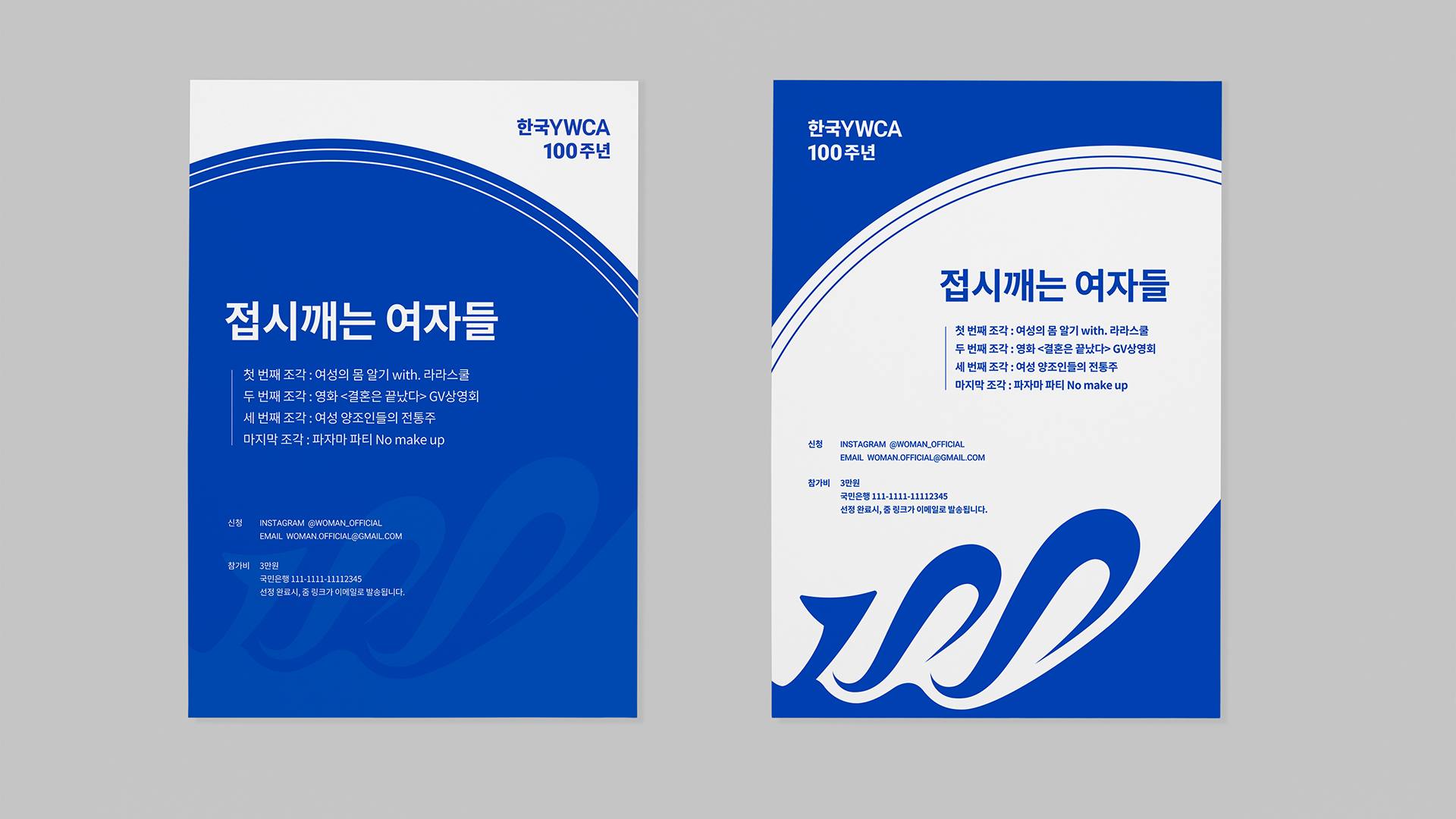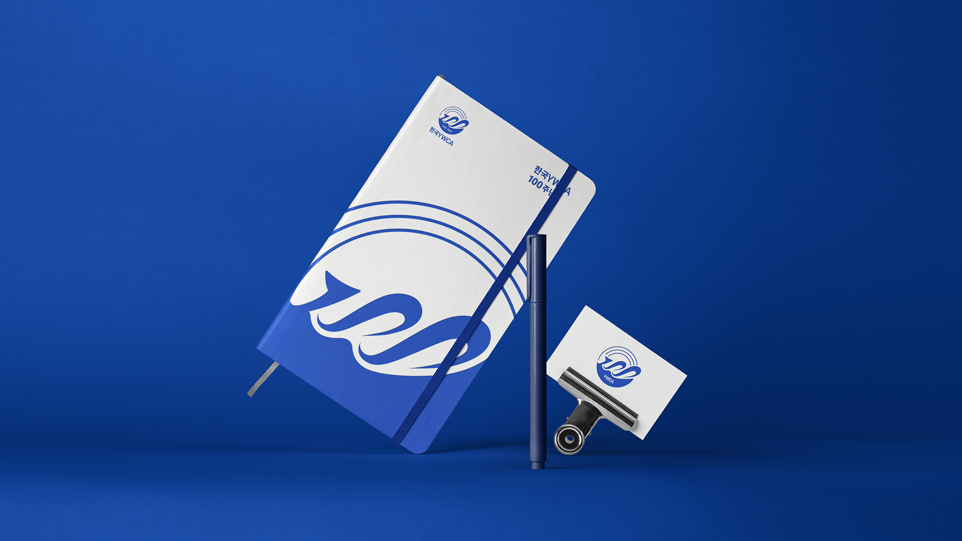 한국YWCA의 100주년 주제에 ‘과거를 조명하고 미래를 다짐’하는 의미를 담았습니다. 디자인 요소별 의미입니다. 중앙에는 100주년을 알리는 숫자 ‘100’을 형상화했습니다. ‘1’을 깃발처럼 표현하여 ‘앞으로 항해하는 배’의 느낌을 주었고, ‘00’은 파도가 커지는 형상으로 미래에도 계속 항해하고 있을 YWCA 활동의 역동성을 표현했습니다. 상단은 무지개를 표현하여 희망과 미래, 다양한 회원들의 모습을 의미로 답았고, 하단의 물결은 ‘W’(더블유) 여성을 상징하고, 무지개와 하단의 물결은 C, 기독성을 상징합니다. 즉, 기본정신인 C(기독성) 안에 여성과 다양성, 100주년을 담아내어 힘차게 항해하는 YWCA의 역동성을 표현합니다. 물결 안에는 YWCA 창립 연도와 100주년을 맞는 연도를 표기하여 100주년 엠블럼의 의미를 더했습니다.