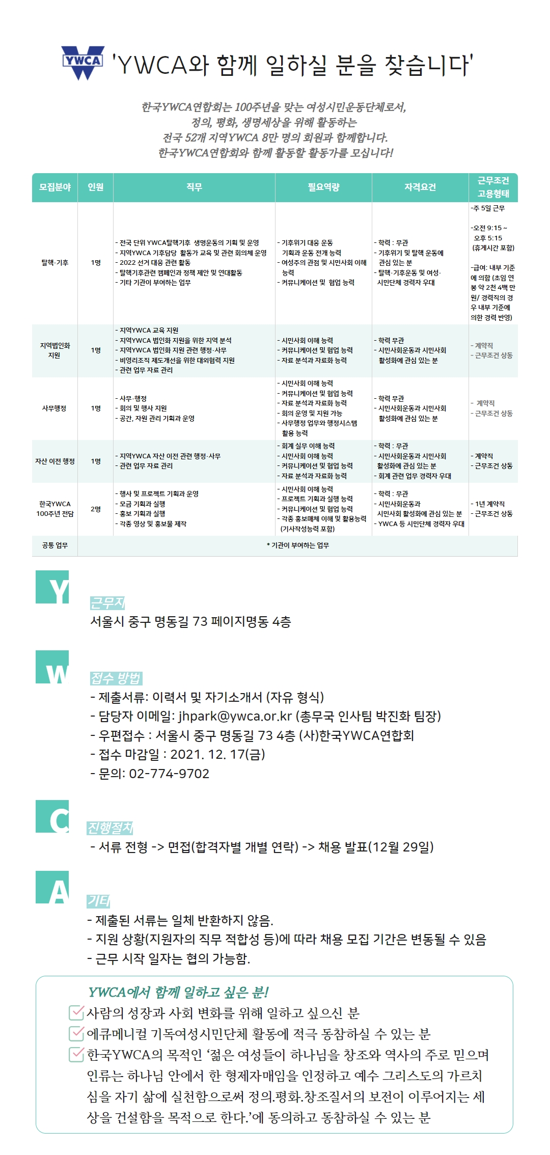 – 담당자 이메일: jhpark@ywca.or.kr (총무국 인사팀 박진화 팀장)
