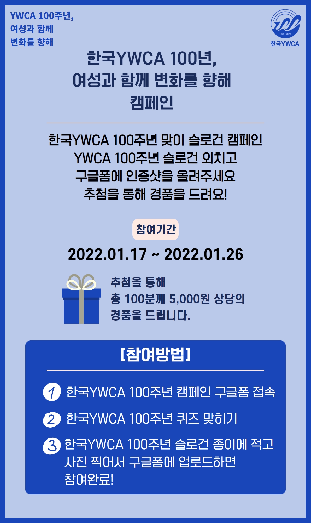 1월 17일부터 1월 26일까지 한국YWCA 100주년 캠페인에 참여해주신 분 중, 100분을 추첨해 5,000원 상당의 경품을 드립니다.