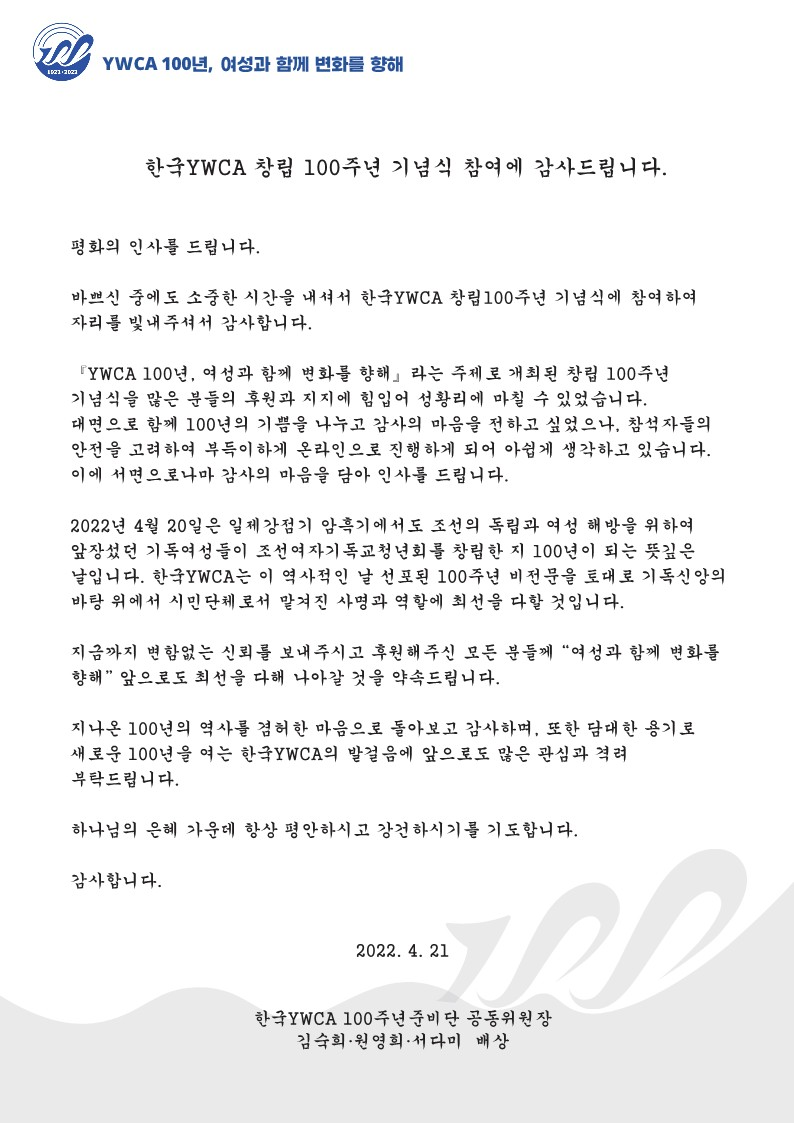 한국YWCA 창립 100주년 기념 감사인사 2022.04.20