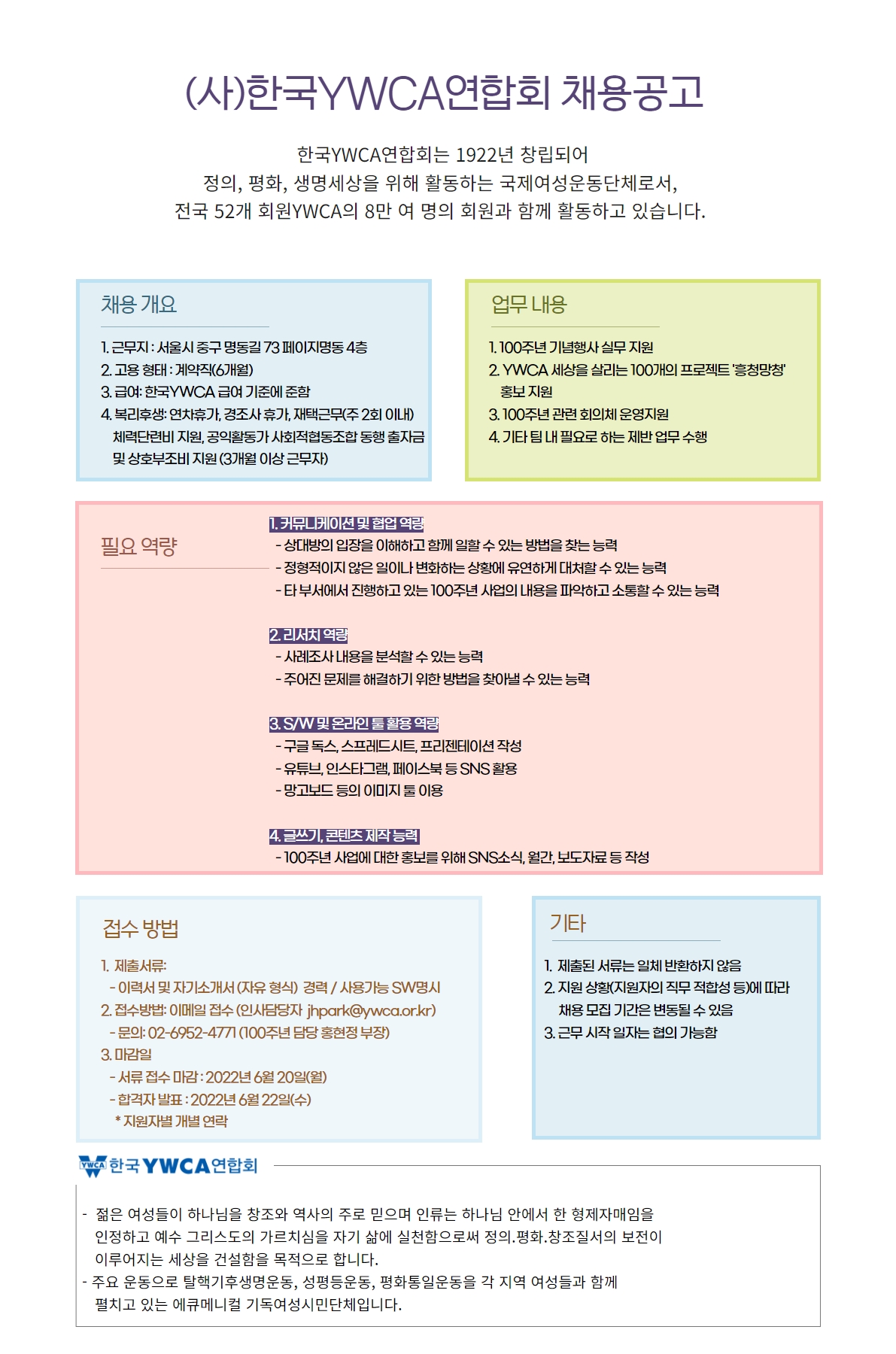 올해로 창립 100주년이 된 국내 최초이자 가장 오래된 국제여성단체인 한국YWCA연합회(https://www.ywca.or.kr)에서 100주년 사업을 담당할 실무활동가를 찾고 있습니다. 시민단체 활동에 관심이 있고 52개 회원YWCA 및 시민들과 온, 오프라인에서 적극적으로 소통할 수 있는 분들의 많은 지원 부탁드립니다.
