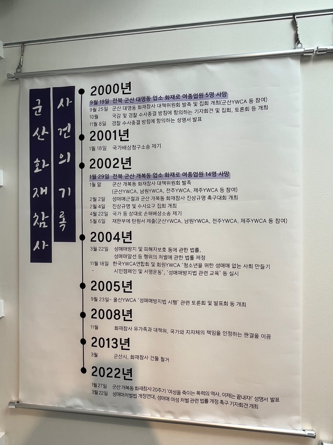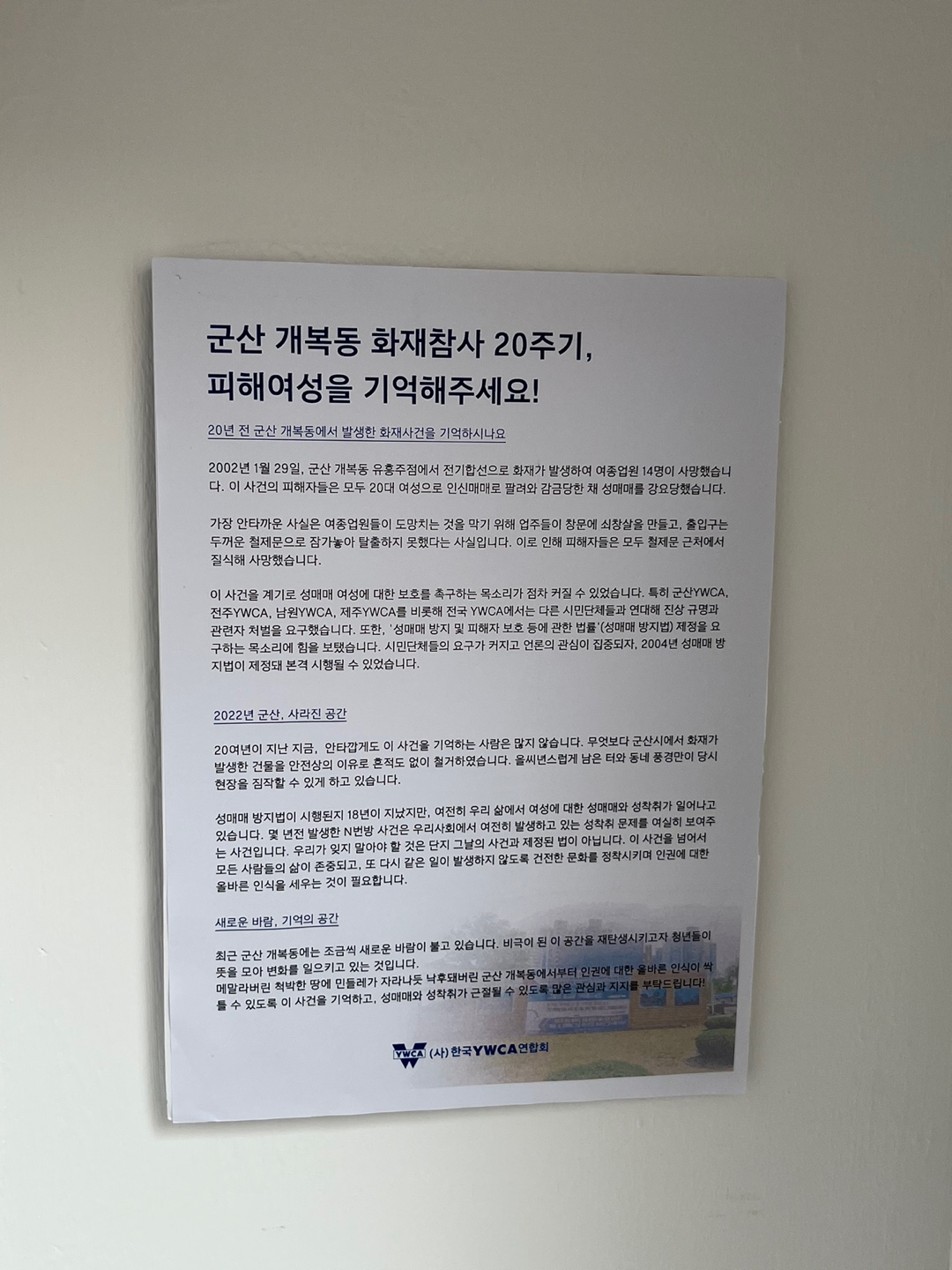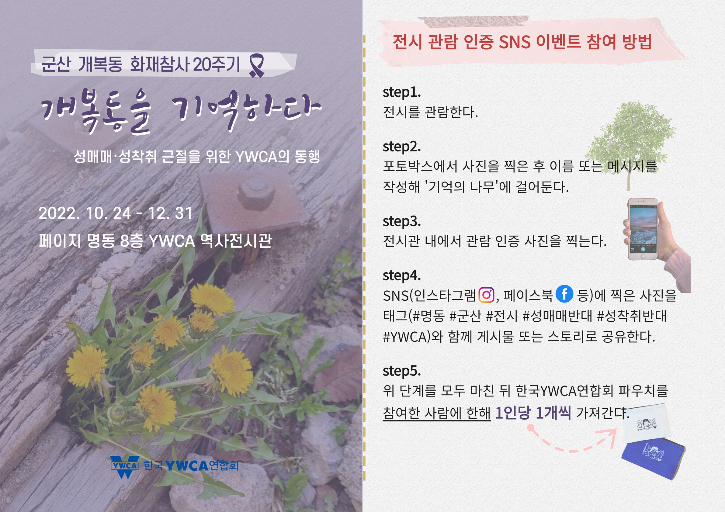 한국YWCA연합회는 군산 개복동 화재참사 20주기를 맞아 ‘개복동을 기억하다’를 주제로 전시를 진행합니다. 이번 전시는 지난 7월 온라인모금을 통해 모인 후원금으로 마련됐습니다. 전시는 서울 페이지 명동 8층 역사전시관에서 진행되며, 누구나 무료로 관람하실 수 있습니다. 전시에 참여하셔서 사건에 대한 기록, 개복동의 과거와 현재의 모습, YWCA의 성매매 근절을 위한 다양한 활동을 살펴보시고, 성매매·성착취가 근절될 수 있도록 바람을 담아 메시지를 남겨주시길 바랍니다. 관람을 인증해주시는 분들에게는 한국YWCA 100주년 기념 파우치를 선물로 제공하고 있으니, 많은 참여 부탁드립니다.