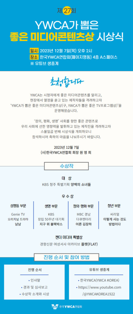 ▪️행사명: 제27회 YWCA가 뽑은 좋은 미디어콘텐츠상 시상식