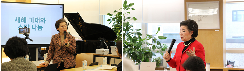 ▲새해 기대와 소망을 나누고 있는 (왼쪽 사진) 차경애 명예연합위원, (오른쪽 사진) 이행자 명예연합위원.