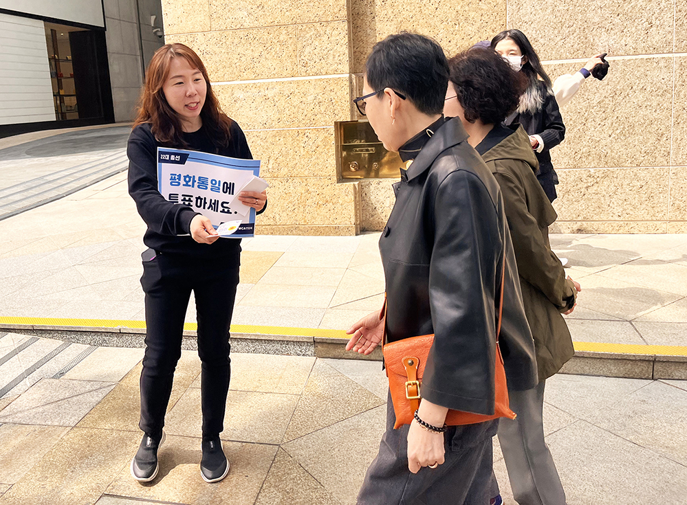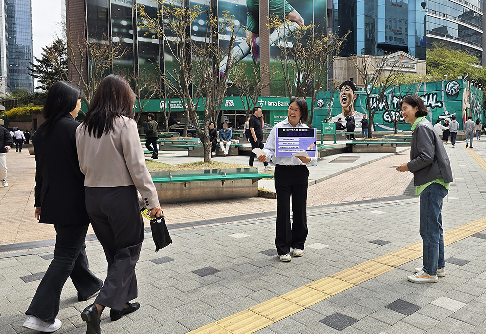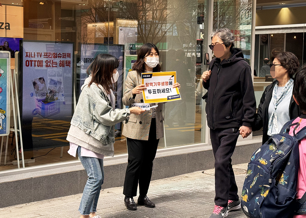 ▲시민들에게 22대 총선 한국YWCA 정책의제를 알리고, 투표 참여도 독려하는 한국YWCA연합회와 서울YWCA 활동가들.