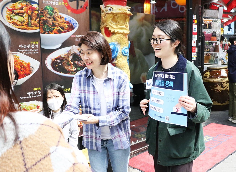 활동가들은 한국YWCA 정책 의제가 담긴 피켓을 들고 스티커를 나눠주며 활동을 벌였다.