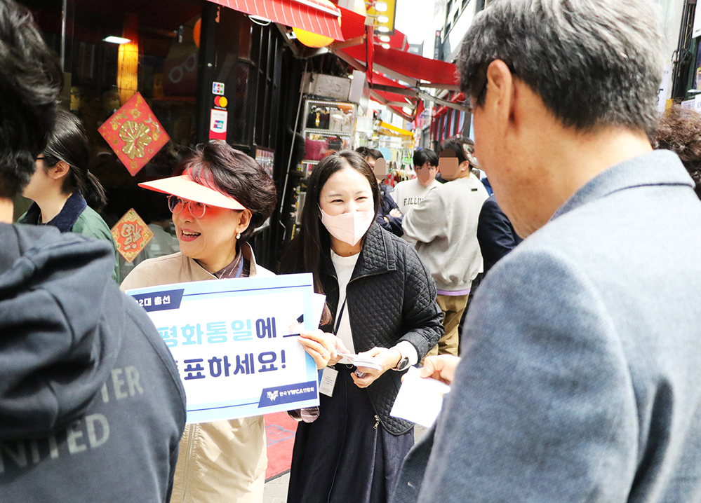 한국YWCA연합회는 4월 4일(목) 정오 명동성당 앞과 을지로, 명동 거리에서 시민들을 대상으로 <22대 총선 유권자 캠페인>을 진행했다. 서울YWCA 활동가들도 캠페인에 동참했다.