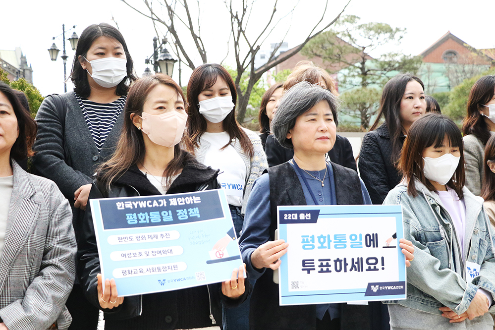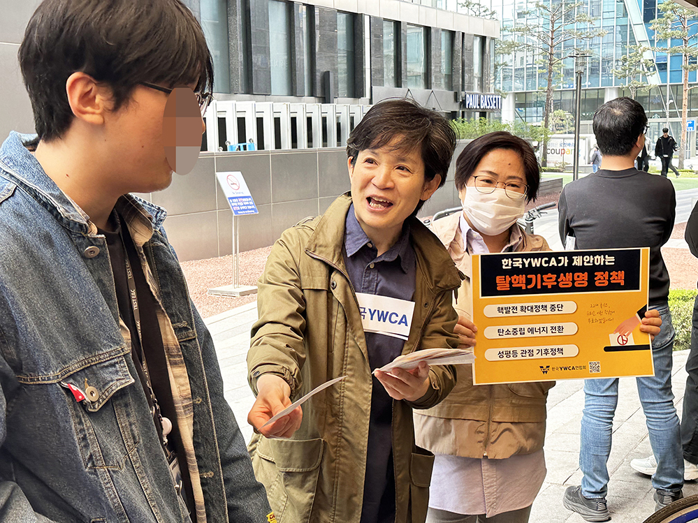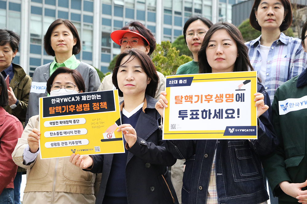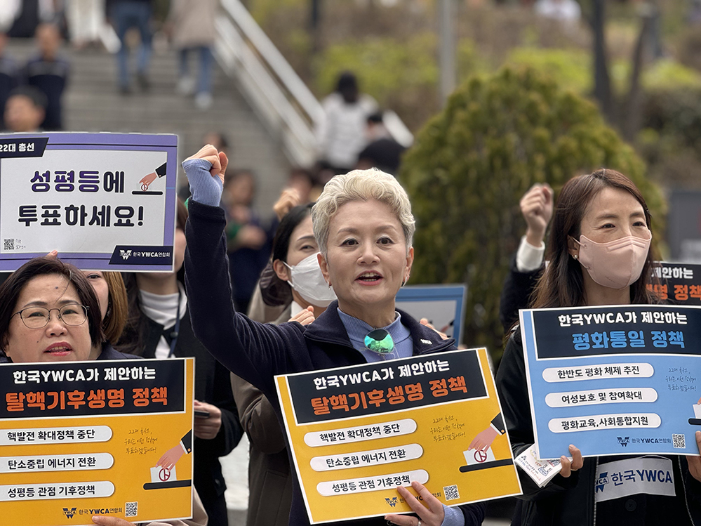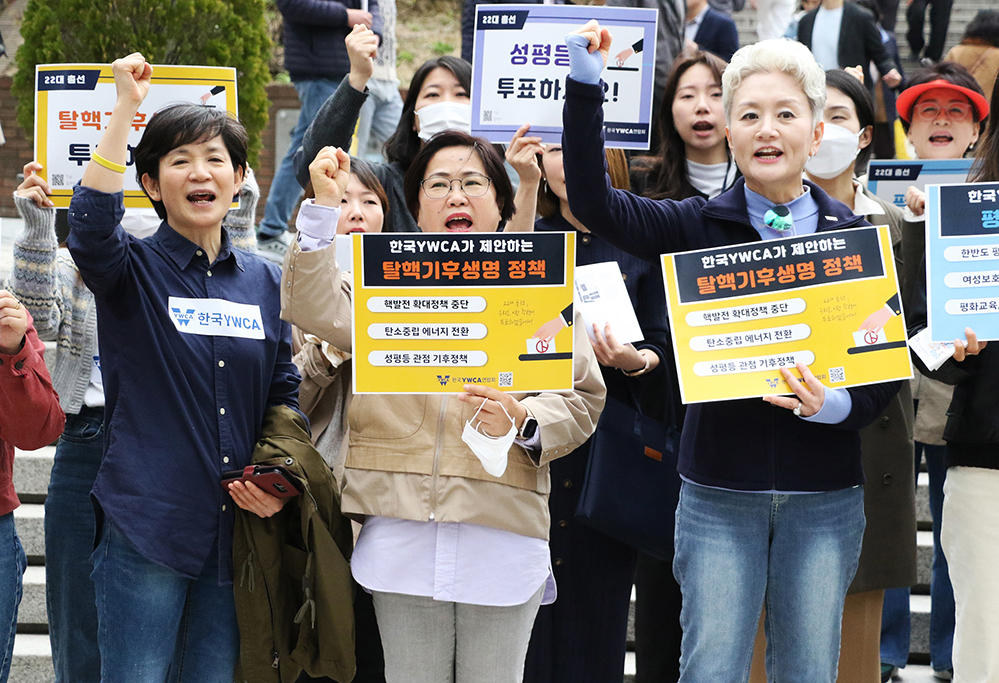 ▲한국YWCA의 ‘탈핵기후생명 정책’ ‘성평등 정책’ ‘평화통일 정책’ 팻말을 들고 있는 활동가들.