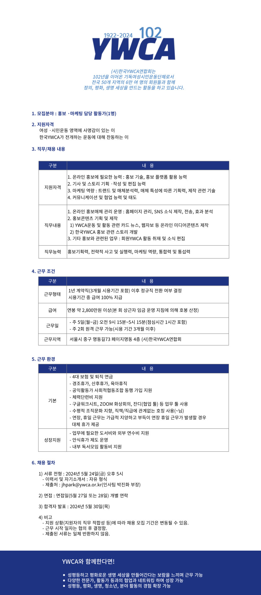 (사)한국YWCA연합회 채용공고(홍보·마케팅 담당 활동가)