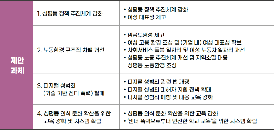 한국의 전반적인 성평등 문화 정착 및 성평등한 노동환경 개선, 디지털 성범죄 철폐를 위해서는 무엇보다 성평등 정책을 추진할 컨트롤 타워의 역할과 권한과 역할이 확대되어야 하며, 정부 부처의 종합적인 정책 도입 및 실행이 필수적으로 이행되어야 한다.