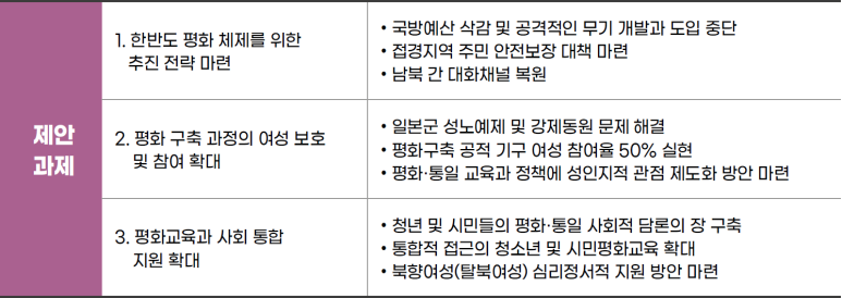 평화에 대한 사회적 공감대 형성이 무엇보다 중요하다. 사회 각 분야에서 인권, 평등, 민주주의의 통합적 관점을 통한 평화교육이 요구된다. 청소년과 청년세대와 공직자들의 평화교육 의무화, 그리고 일반시민들의 평화적 담론의 장과 교육의 기회가 확대되어야 한다. 더불어 ‘먼저 온 통일’로 불리는 북향 여성들을 위한 통합적인 지원과 요구를 반영한 지원 시스템 확충이 요구된다.