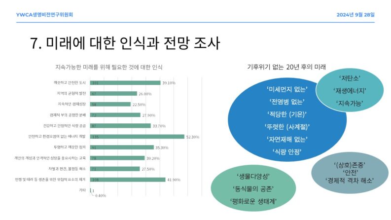 YWCA생명비전연구위원회는 2024년 9월 28일(토) 한국YWCA연합회와 온라인에서 연구 중간보고회를 개최했다. 중간보고회에서는 올해 진행되는 세 연구, YWCA 지역운동의 역량과 지속가능성 연구, 청소년 주도의 탈핵기후생명운동 연구, 아시아 3개국 청년 여성의 SNS사용과 직업선택 및 건강 연구의 연구 모델, 설문조사 진행 및 분석 과정을 공유했다.