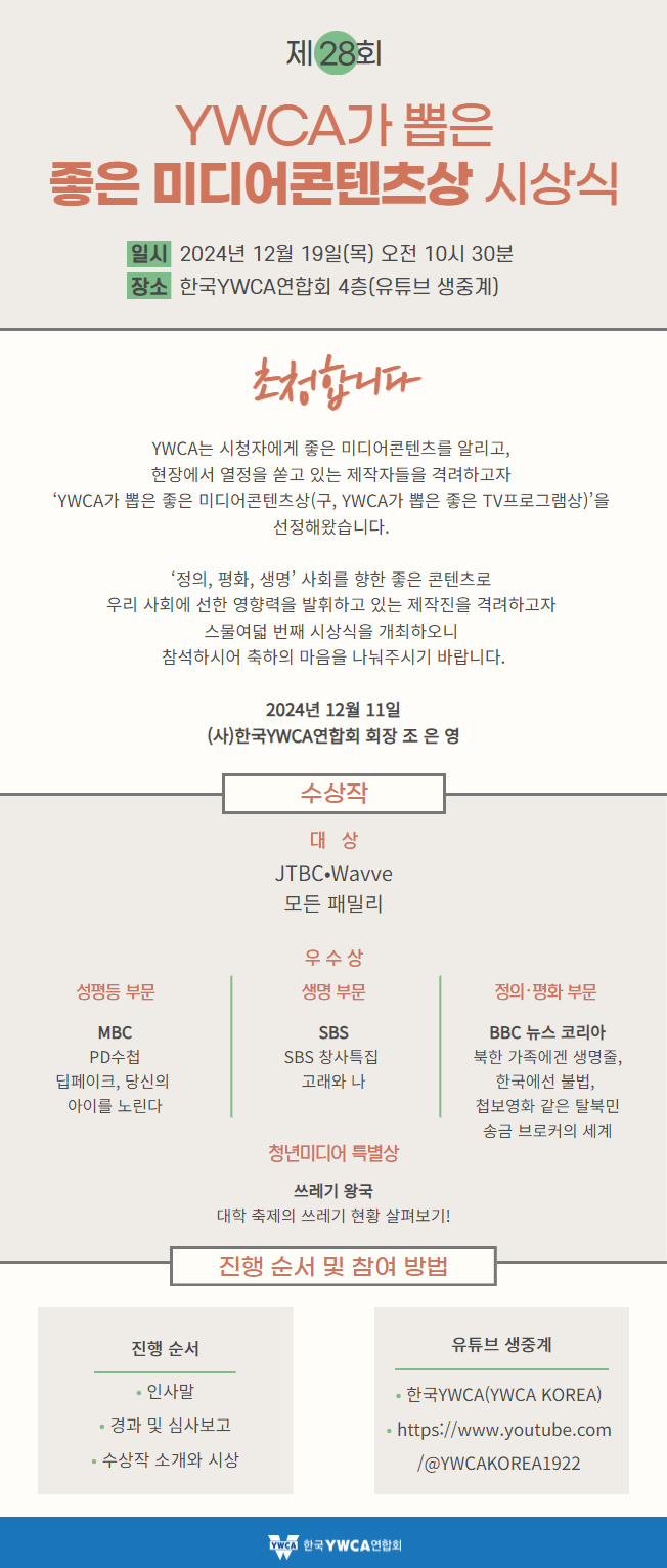 ▪️행사명: 제28회 YWCA가 뽑은 좋은 미디어콘텐츠상 시상식