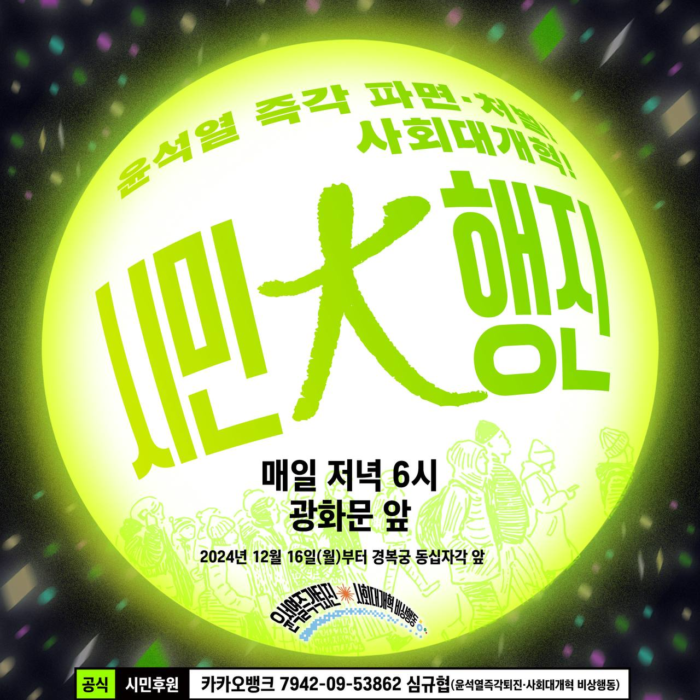 또한, 12월 21일(토) 오후 3시에는 서울 광화문 앞 대규모 촛불 집회 및 행진이 예정되어 있습니다. 전국광역지역에서도 동시다발 촛불대행진이 열립니다.