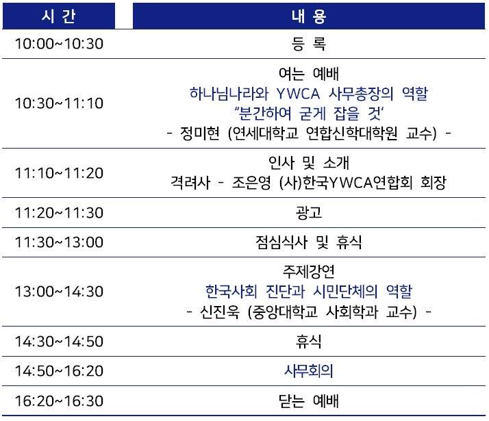 특별히 이번 제1차 YWCA 전국사무총장협의회에서는 “하나님나라와 YWCA 사무총장의 역할 : 분간하여 굳게 잡을 것”을 주제로 정미현 교수(연세대학교 연합신학대학원)의 설교 말씀을 듣고, 12.3 비상계엄 이후 “한국사회 진단과 시민단체의 역할”을 주제로 신진욱 교수(중앙대학교 사회학과 교수)의 주제강연과 사무회의를 통해 2025년 조기 대선 한국YWCA 정책 제안 협의를 진행할 예정입니다.