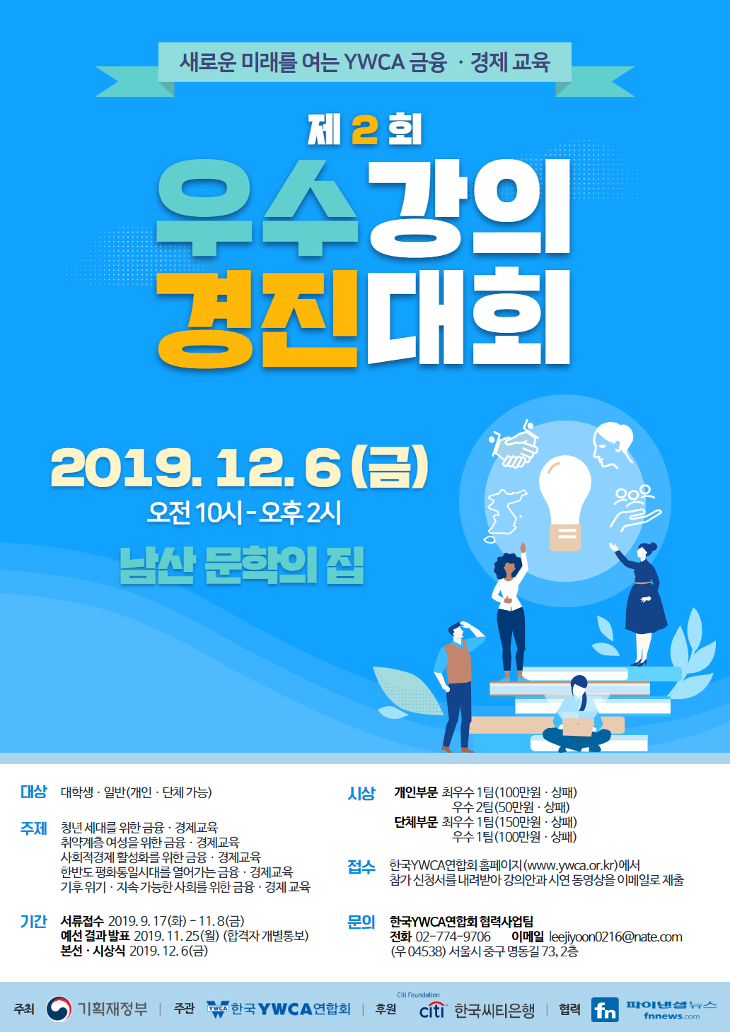 한국YWCA연합회에서는 다양한 주제의 금융·경제교육 내용과 방식을 발굴하고 시도하여, 건강하고 지속가능한 사회를 만들기 위한 제2회 새로운 미래를 여는 YWCA 금융·경제교육 우수강의 경진대회를 개최합니다.
