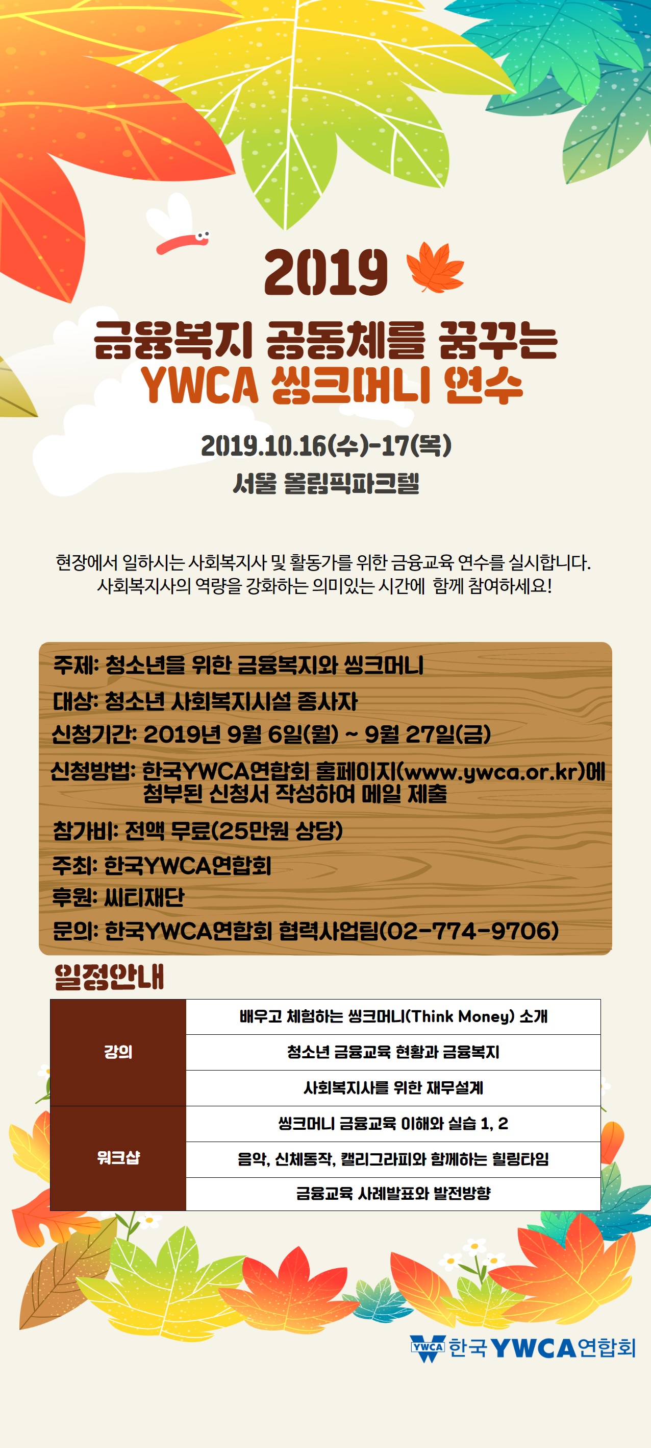 한국YWCA연합회에서는 사회복지현장에서 수고하시는 사회복지사와 활동가분들을 위한 2019년 금융복지공동체를 꿈꾸는 YWCA 씽크머니 연수를 진행합니다.