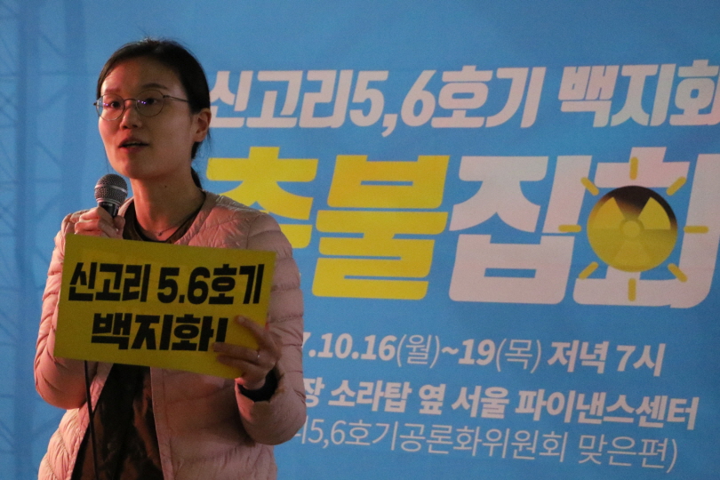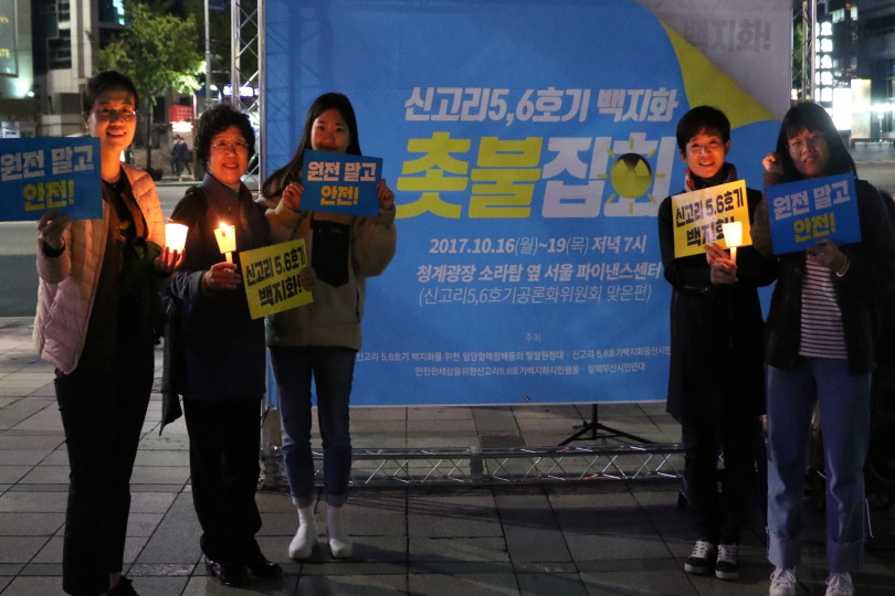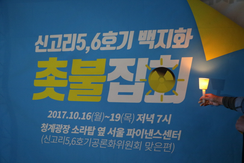 10월 16일(월)부터 19일(목)까지 오후 7시마다 청계광장 소라탑 옆 서울파이낸스센터(신고리 5·6호기 공론화위원회 맞은편)에서 열리는 촛불집회에 함께해주세요:)