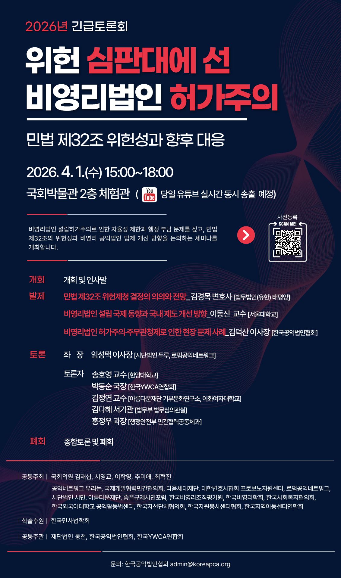 이에, 한국YWCA연합회, 재단법인 동천, 한국공익법인협회 공동주관으로 2026년 긴급국회토론회 <위헌 심판대에 선 비영리법인 허가주의- 민법 제32조 위헌성과 향후대응> 토론회를 아래와 같이 개최합니다.