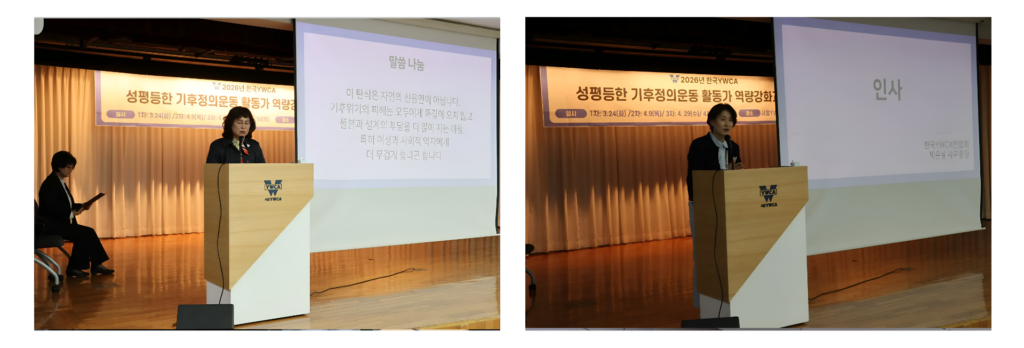 먼저, 경인강원권역 대표 인천YWCA 표신희 회장의 인도와 충청권역 대표 제천YWCA 이숙희 회장의 말씀 묵상으로 여는 예배를 드렸다. 이어 연합회 박은실 사무총장은 환대 인사를 통해, 이번 교육이 단순히 강의를 듣는 자리가 아니라 서로의 경험을 나누며 함께 공부하는 시간으로 만들어가자고 당부하였다.