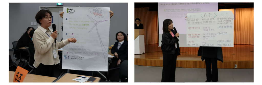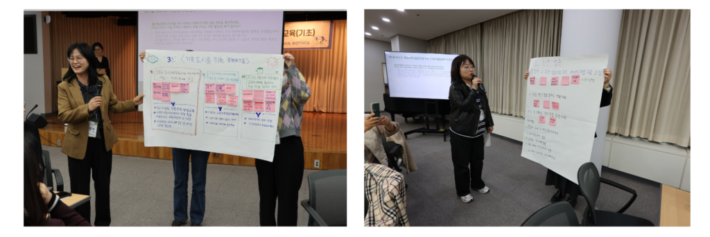 이어진 워크숍에서는 지역에서 시작할 수 있는 실천을 구체화하기 위해 돌봄·먹거리·에너지전환 등 삶과 맞닿은 주제를 중심으로 논의했다. 회원YWCA는 각 지역에서 제안할 수 있는 대안과 실천 방향을 나누고 정리하며, 교육이 현장 적용으로 이어질 수 있는 기반을 함께 만들었다.