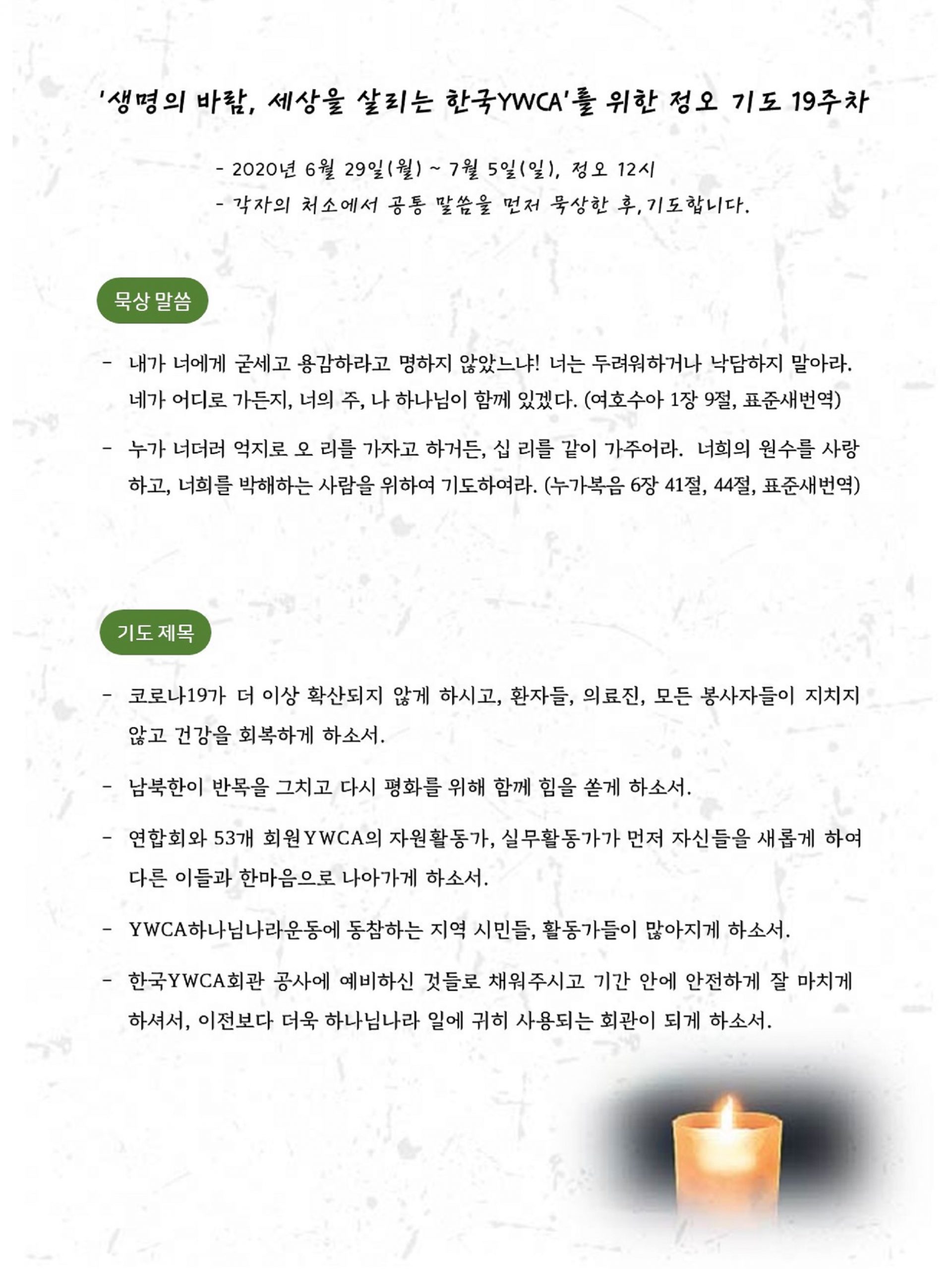 한국YWCA연합회는 2월 21일(금)부터 9월 20일(일)까지 7개월 간 ‘생명의 바람, 세상을 살리는 한국YWCA’를 위한 정오 기도를 진행합니다. 지역사회로 확산되고 있는 코로나19 사태가 빨리 해결되고, 올해 진행될 한국YWCA 활동들 그리고 새로운 모습으로 재탄생할 한국YWCA회관의 변화과정을 위해 특별히 기간을 정해 함께 기도하고자 합니다.