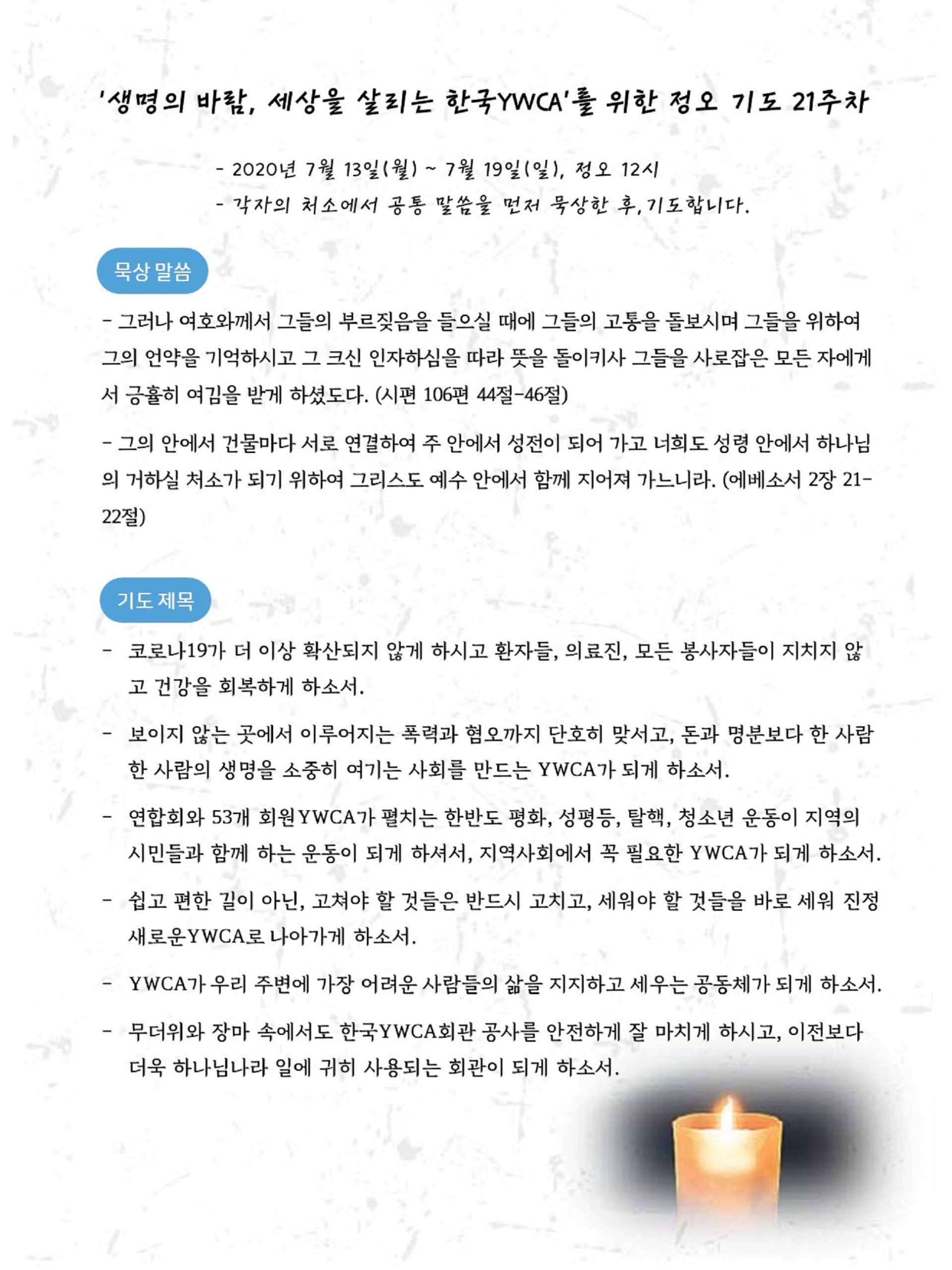 한국YWCA연합회는 2월 21일(금)부터 9월 20일(일)까지 7개월 간 ‘생명의 바람, 세상을 살리는 한국YWCA’를 위한 정오 기도를 진행합니다. 지역사회로 확산되고 있는 코로나19 사태가 빨리 해결되고, 올해 진행될 한국YWCA 활동들 그리고 새로운 모습으로 재탄생할 한국YWCA회관의 변화과정을 위해 특별히 기간을 정해 함께 기도하고자 합니다. 각자의 처소에서 마음 모아 기도해주시면 감사하겠습니다.
