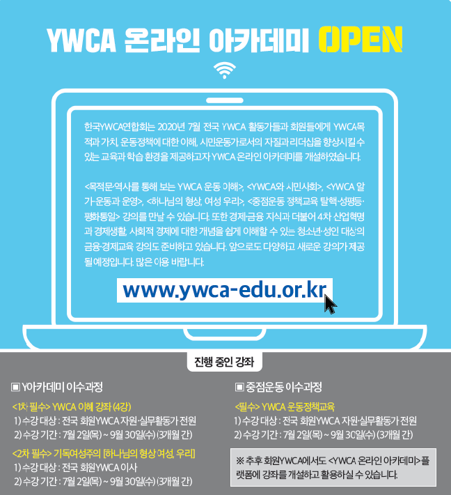 한국YWCA연합회는 2020년 7월 전국 YWCA 활동가들과 회원들에게 YWCA 목적과 가치, 운동정책에 대한 이해, 시민운동가로서의 자질과 리더십을 향상시킬 수 있는 교육과 학습 환경을 제공하고자 YWCA 온라인 아카데미를 개설하였습니다.