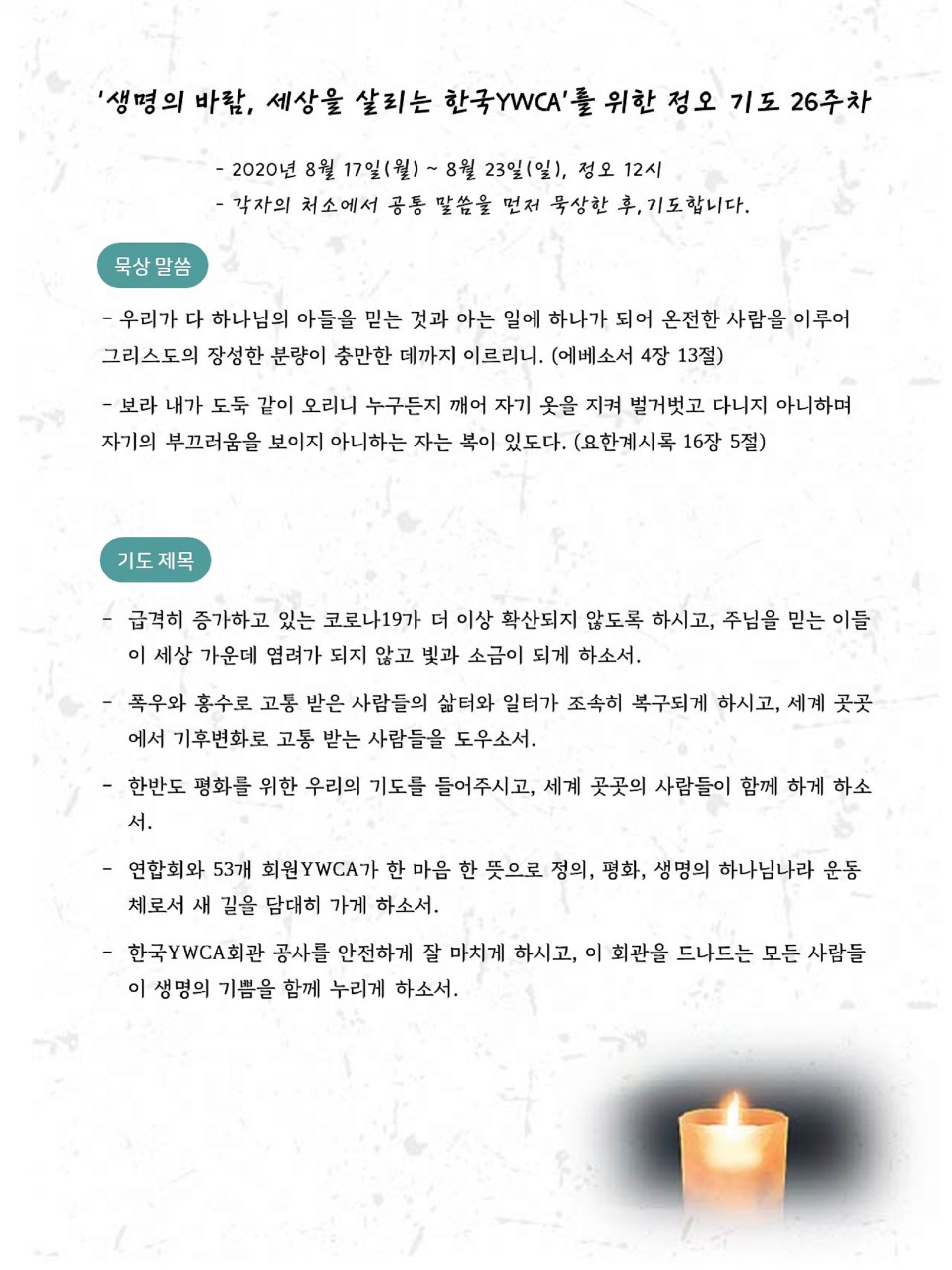 ‘생명의 바람, 세상을 살리는 한국YWCA’를 위한 정오 기도㉖ 2020.08.17