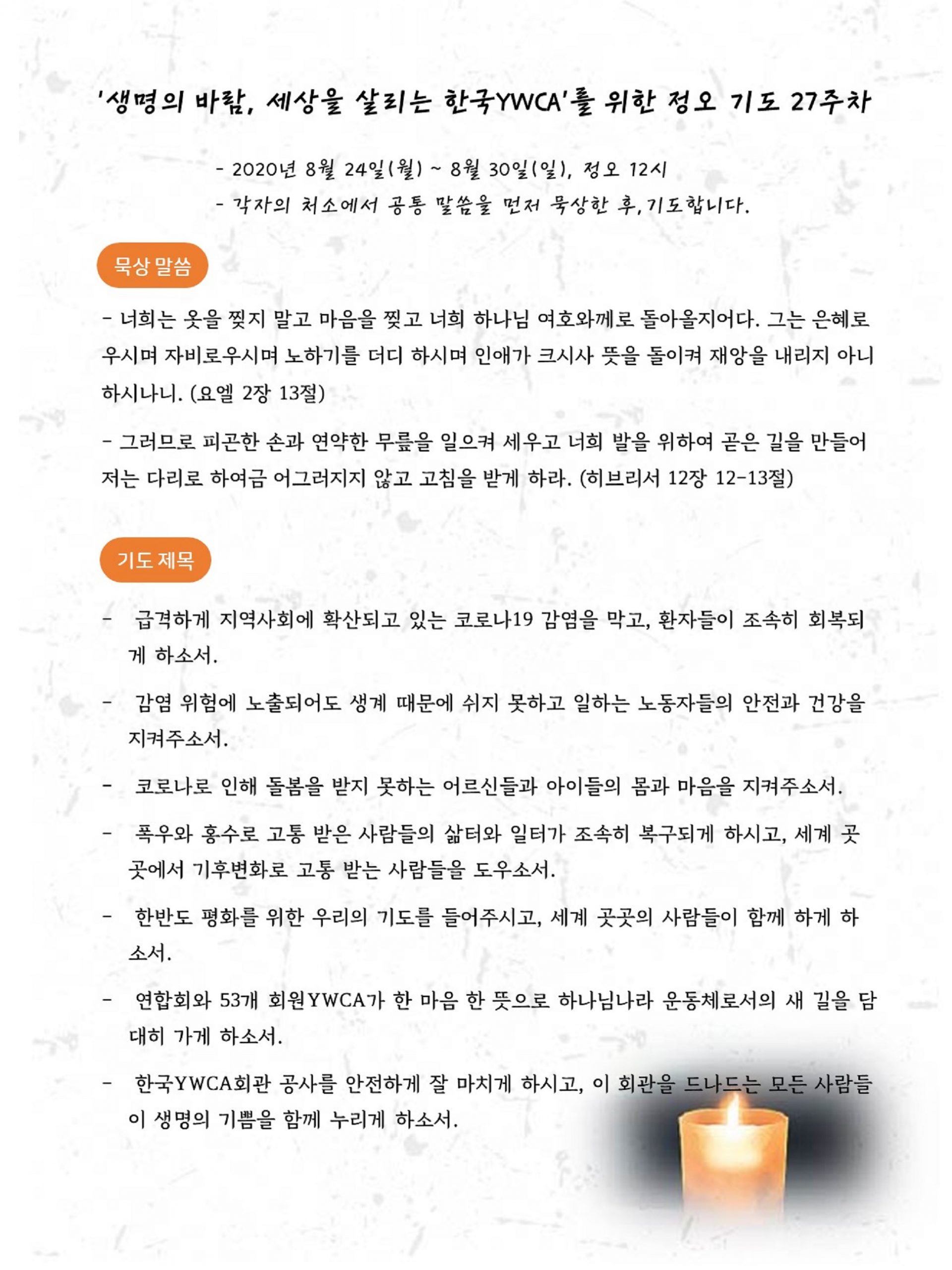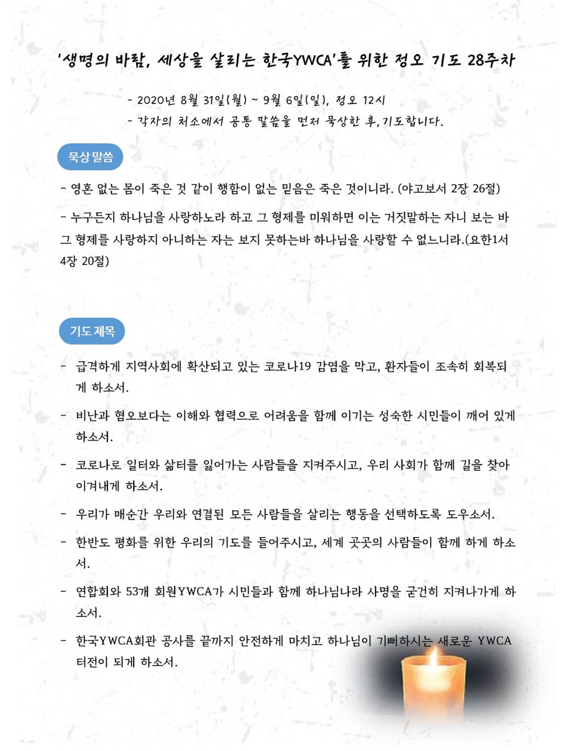 ‘생명의 바람, 세상을 살리는 한국YWCA’를 위한 정오 기도㉘ 2020.08.31