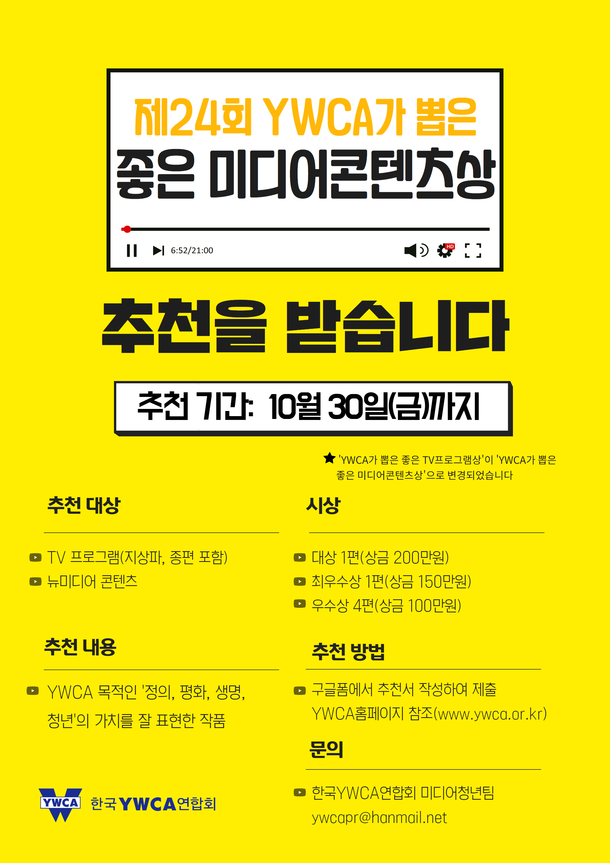 ‘정의, 평화, 창조질서의 보전’이 이루어지는 세상을 이루고자 활동을 펼치는 YWCA는 ‘정의, 평화, 생명의 가치’를 잘 표현한 우수 미디어 콘텐츠를 선정해, 올바른 미디어 문화를 정착하고 건강한 공동체 사회 구현에 애쓰는 제작자를 격려하고자 합니다. 콘텐츠 추천에 많은 관심과 참여 부탁드립니다.