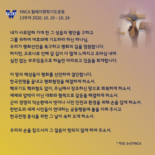 이번 주간 논산YWCA기도는 한반도종전평화캠페인의 내용을 담아주셨습니다. 기도와 더불어 피스 챌린지 운동으로, 화해와 평화를 위한 변혁자로서의 길을 열어주시기를 부탁드립니다.