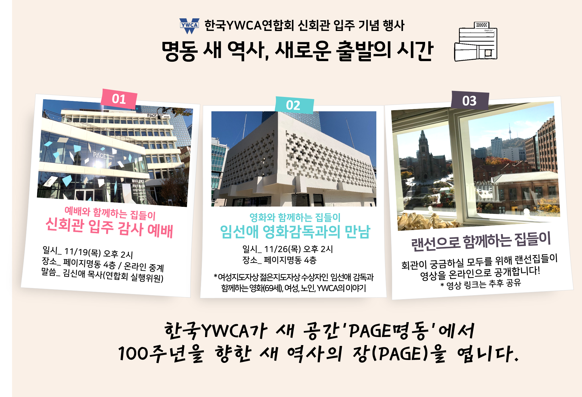 지난 8개월간의 리모델링을 완료하고 새로 입주하는 한국YWCA회관(페이지명동)에서 감사와 축하의 의미를 나누고, 새로운 페이지에 써 내려갈 공간을 소개하는 ‘명동 새역사, 새로운 출발의 시간’ 행사를 진행합니다.