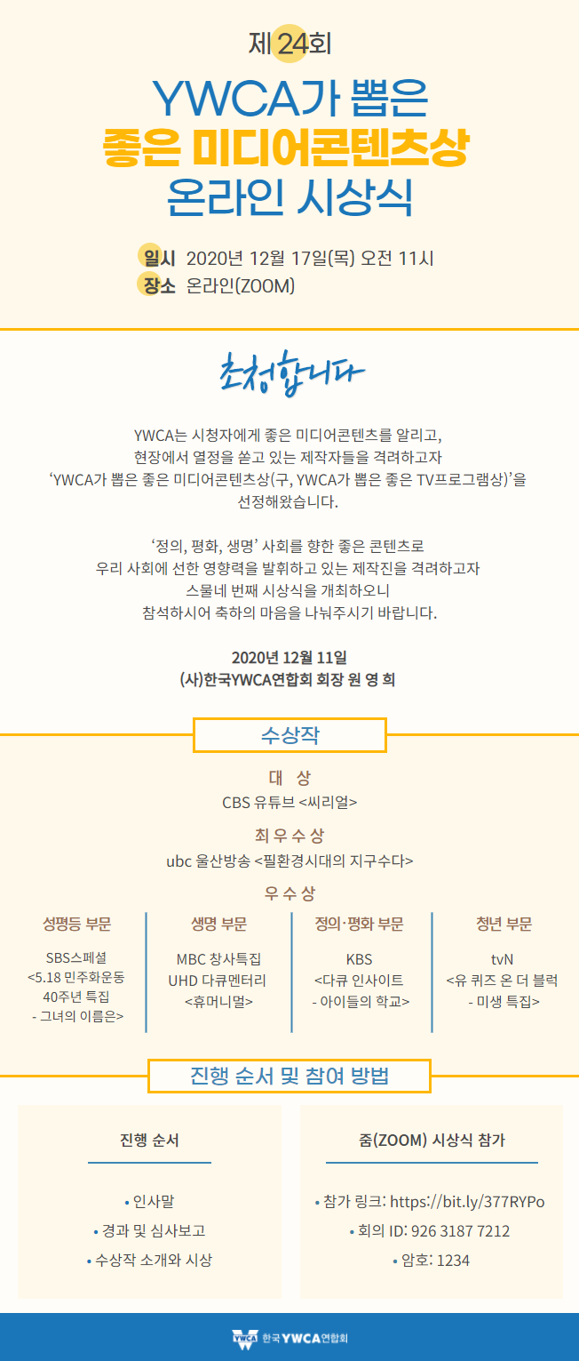 제24회 YWCA가 뽑은 좋은 미디어콘텐츠상 시상식은 오는 12월 17일(목) 오전 11시 ‘온라인(줌) 시상식’으로 진행될 예정입니다.